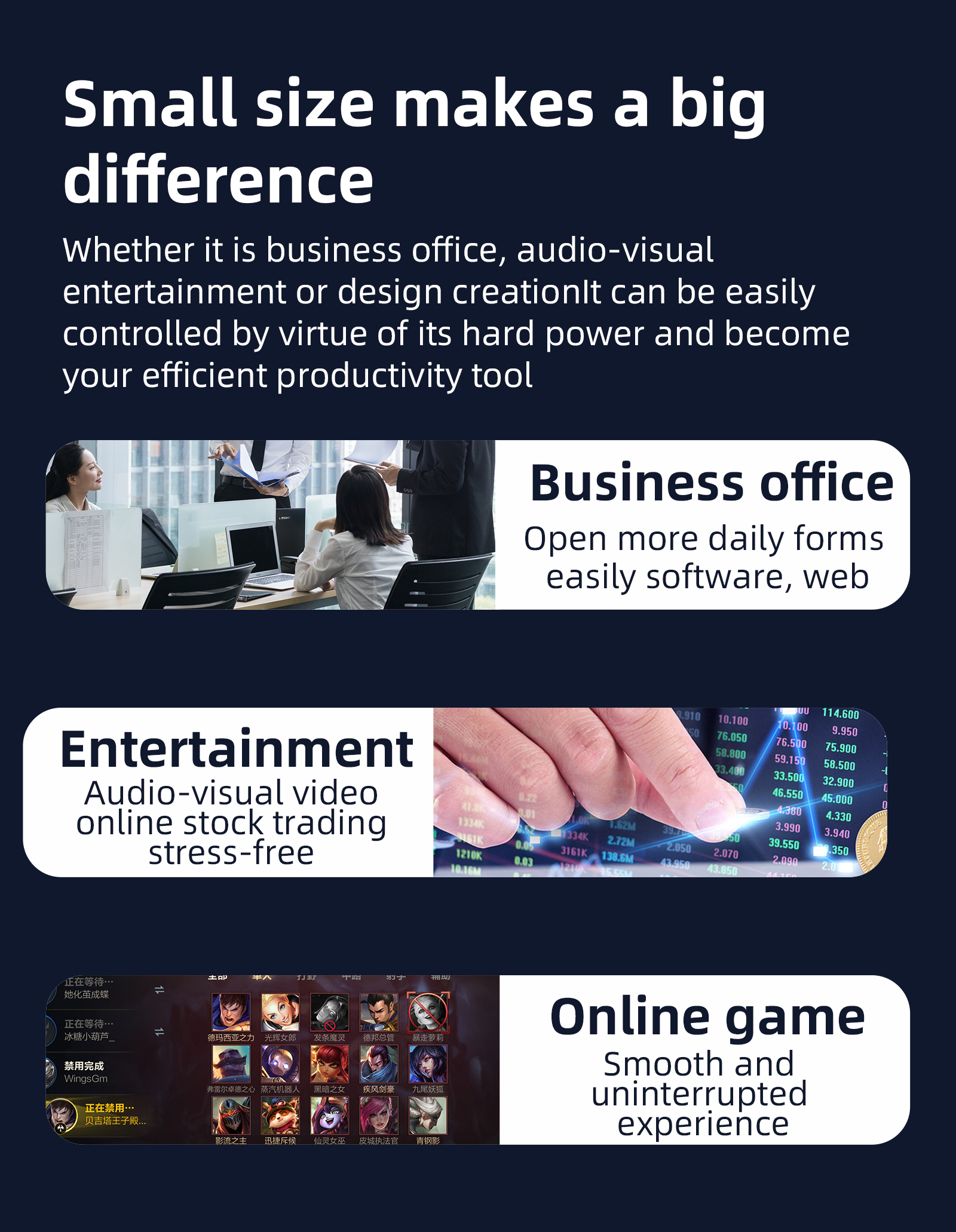 BT4.2 / WiFi 5/3 displays--HDMI (4K@60Hz)*2, DP (4K@60Hz)*1/USB3.2(Gen1*1 5Gbps/S)*3/ HDMI*2 4096 x 2160@60Hz/ DP V1.4*1 4096 x 2160@60Hz/ 1*3.5 mm headphone jack / Giga LAN (RJ45)*2 1000M