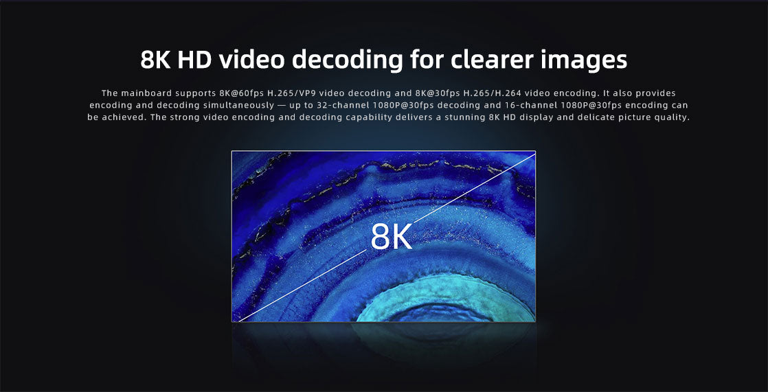 Hardware decoding: 8K@60fps H.265/VP9/AVS2, 8K@30fps H.264 AVC/MVC, 4K@60fps AV1, 1080P@60fps MPEG-2/-1/VC-1/VP8 Hardware encoding: 8K@30fps H.265 / H.264 |