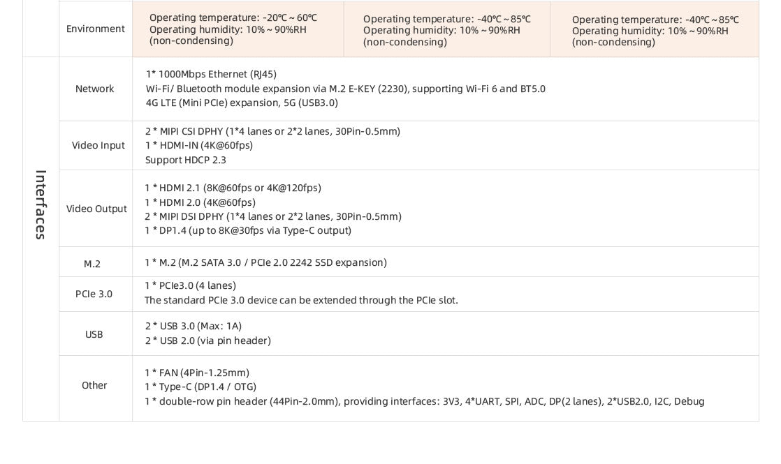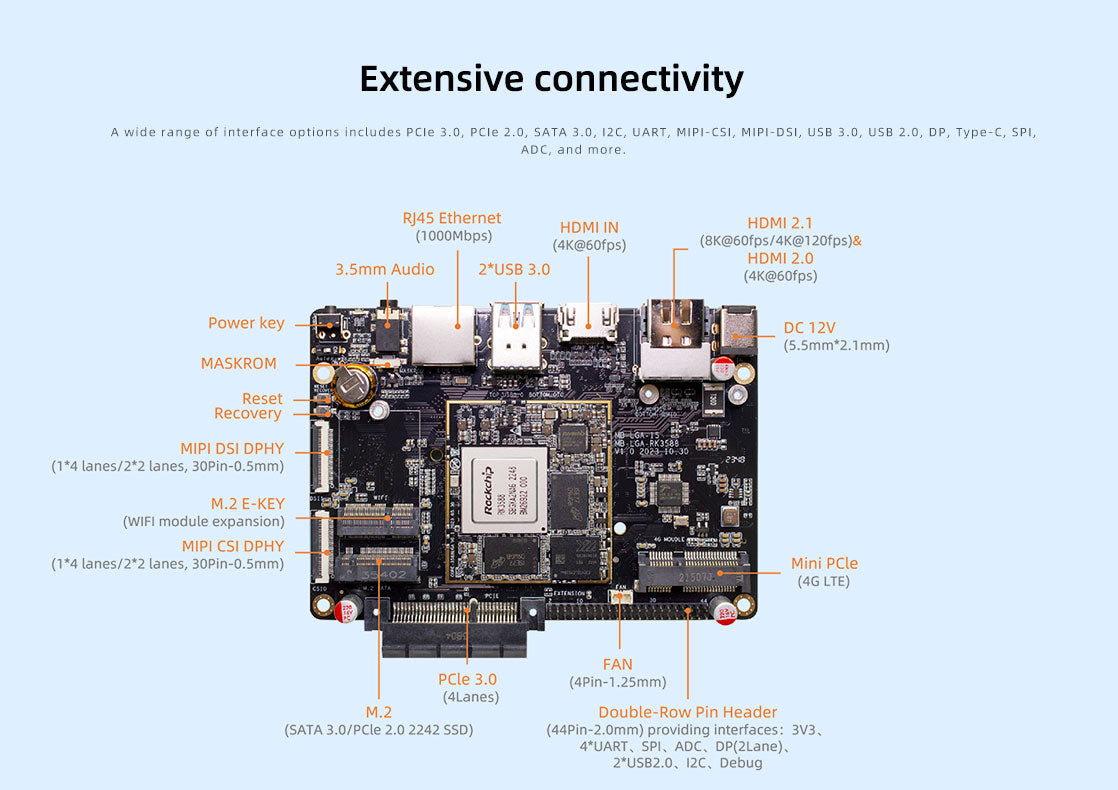 1 * FAN (4Pin-1.25mm) 1 * Type-C (DP1.4 / OTG) 1 * double-row pin header (44Pin-2.0mm), providing interfaces: 3V3, 4*UART, SPI, ADC, DP(2 lanes), 2*USB2.0, I2C, Debug |