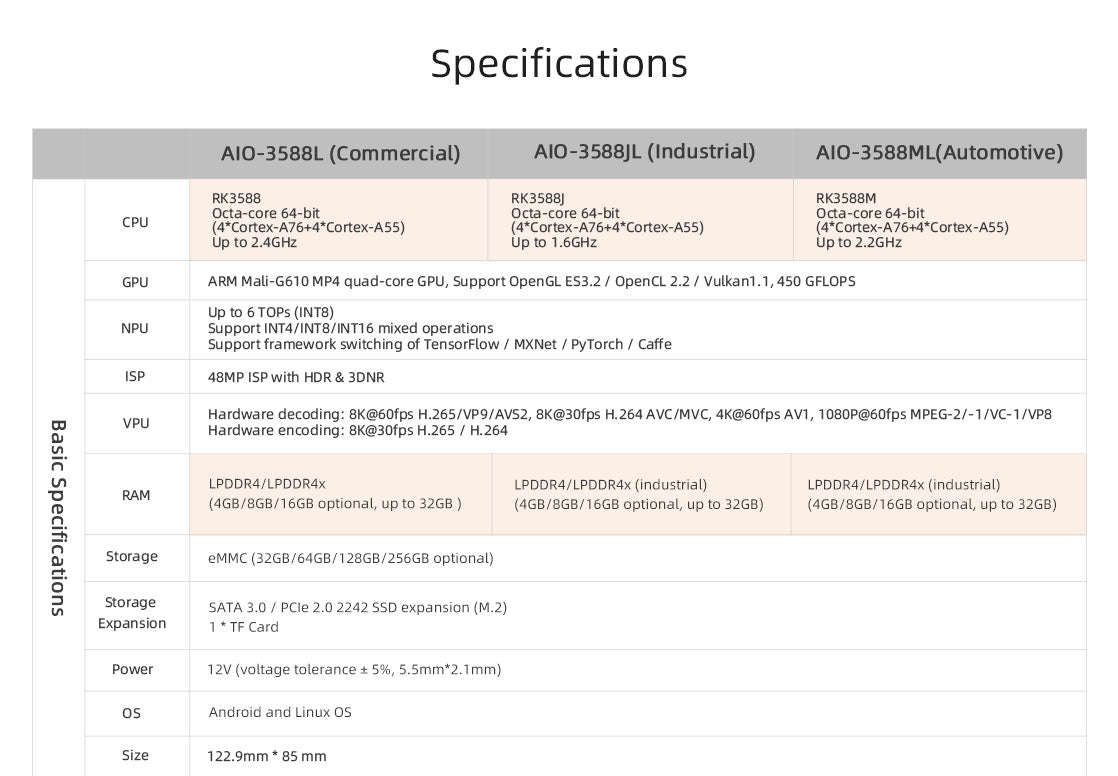 | AIO-3588L (Commercial) | AIO-3588JL (Industrial) | AIO-3588ML(Automotive) | |||