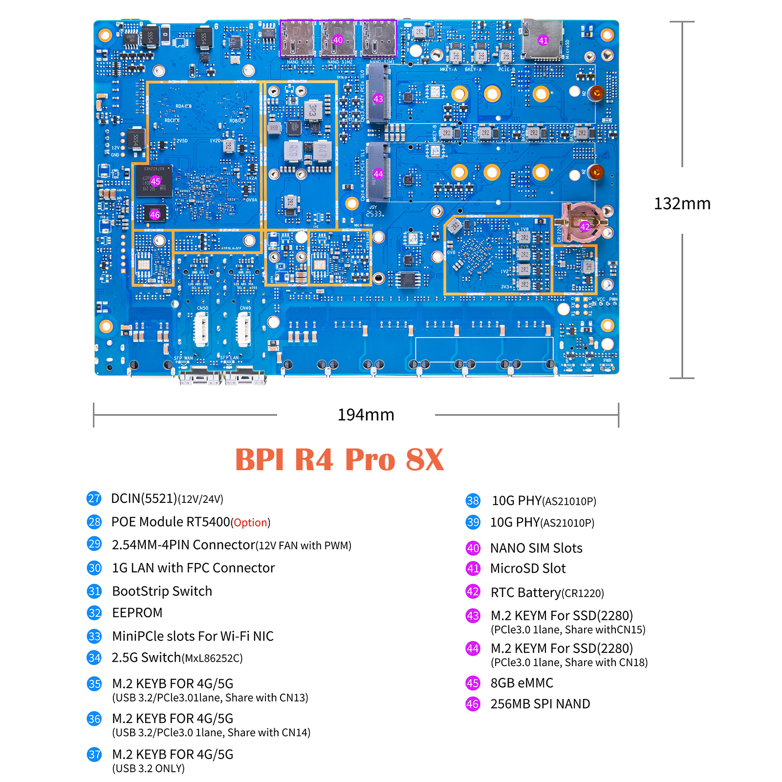Banana Pi BPI-R4Pro Router board with MediaTek MT7988A(Filogic 880) Quad-core ARM Corex-A73 design ,4GB/8GB DDR4 RAM,8GB eMMC,256MB SPI-NAND flash onboard.It supports 4 x 2.5G network ports and 2 x 10G SFP+/RJ45 ports, support 4G/5G expansion. it is a update version for BPI-R4.