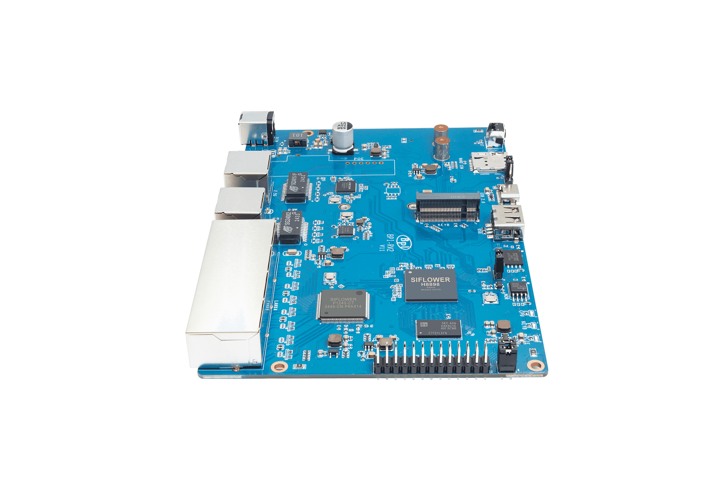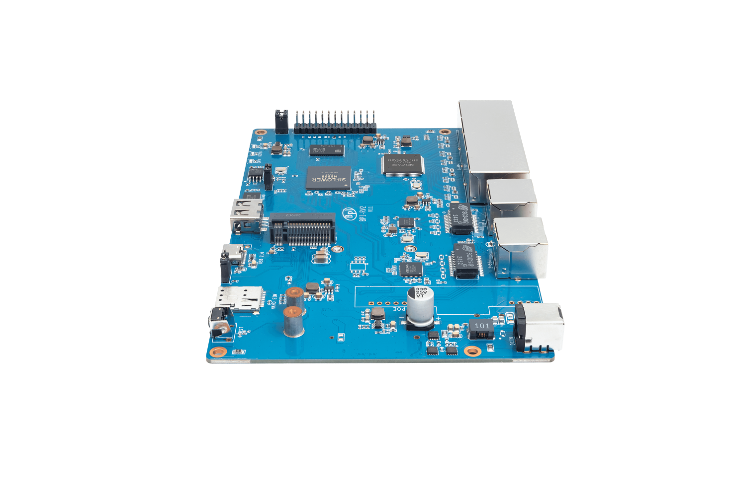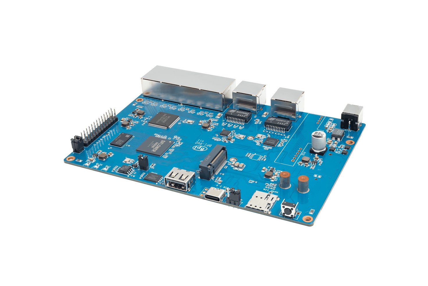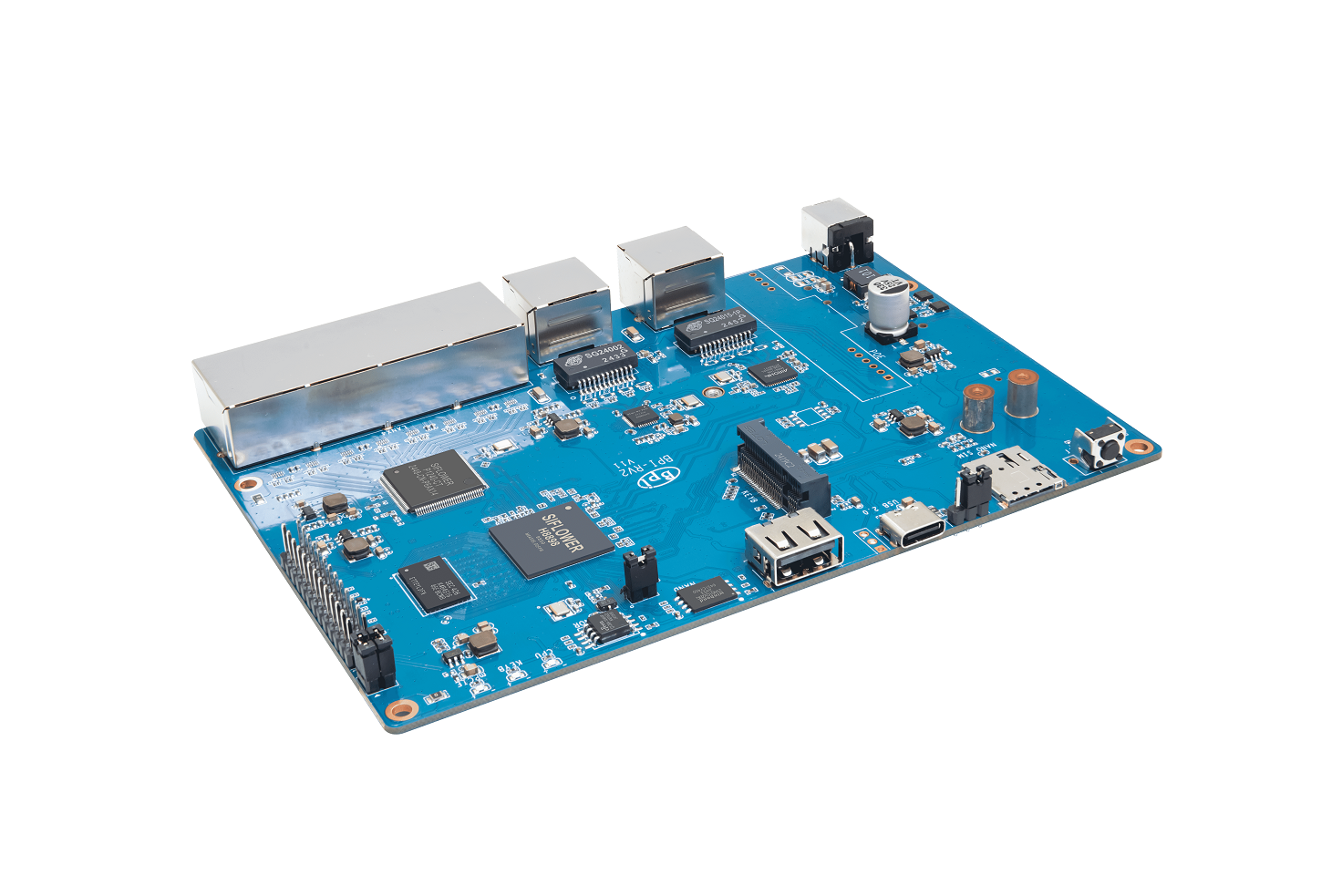 Banana Pi BPI-RV2 open source gateway is a device based on Siflower SF21H8898 SoC, 1 × 2.5G WAN network interface, 5 Gigabit LAN network interface, onboard 512MB DDR3 memory, 128 MiB NAND, 16 MiB NOR, M.2 interface, MINI PCIE and USB 2.0 interface, etc.