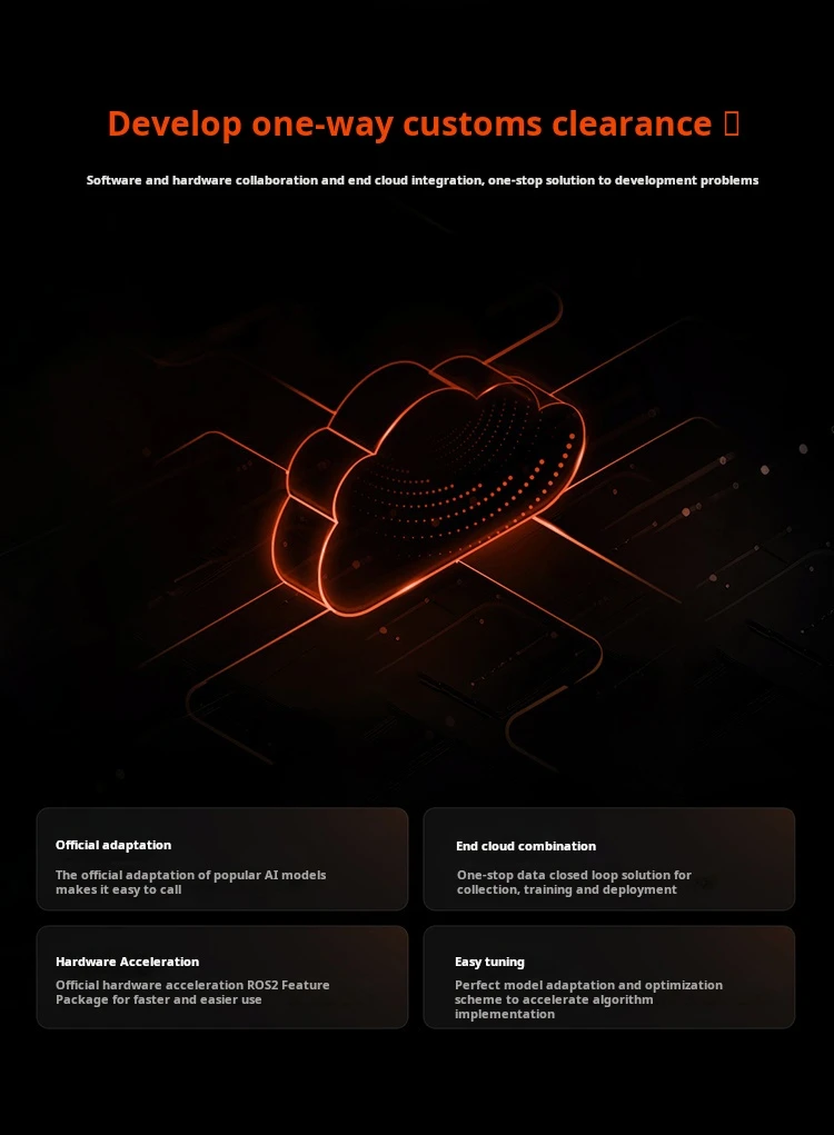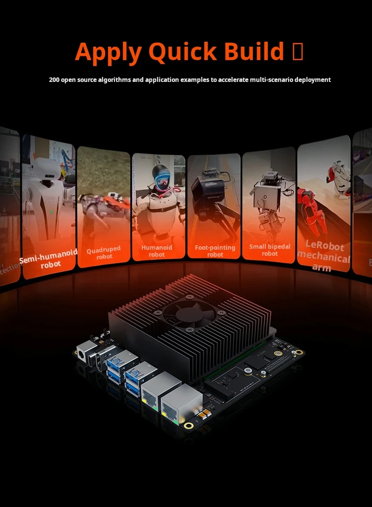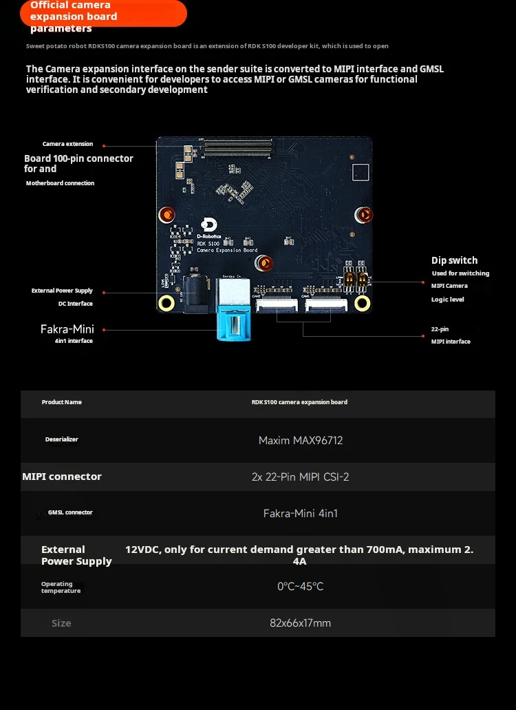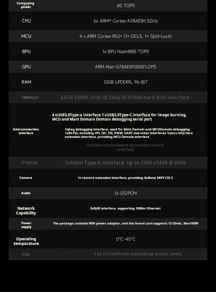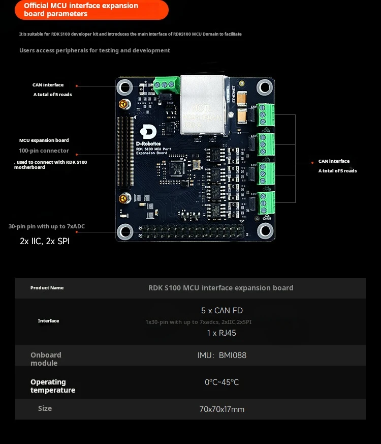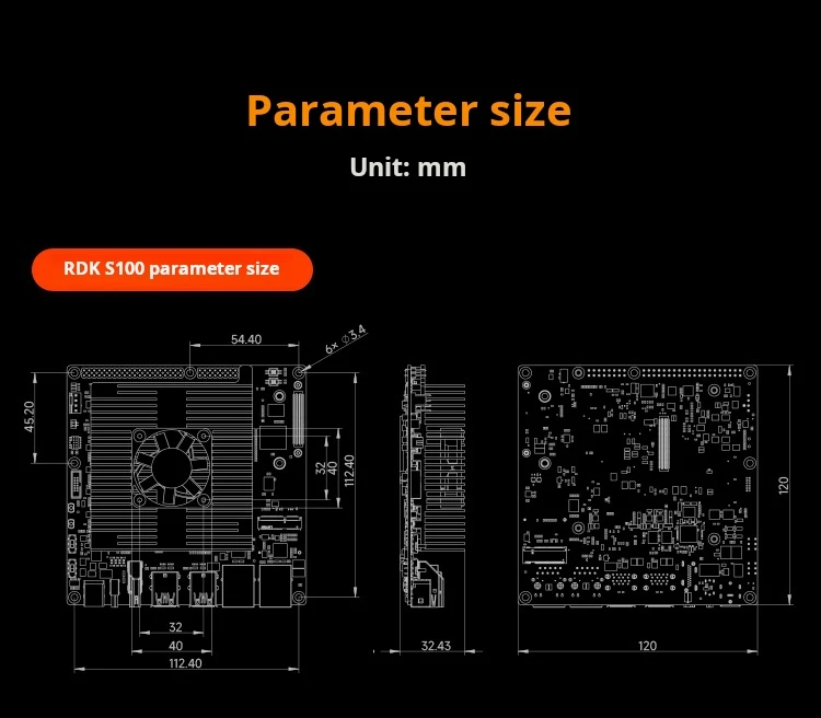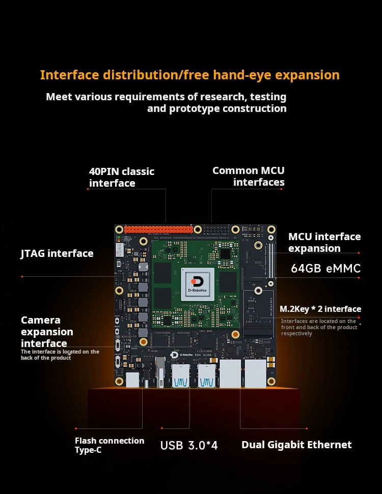 The D-Robotics RDK S100 is a developer kit for intelligent computing and robotics. It features the S100 chip and BPU with 80TOPS computing power. Its heterogeneous architecture integrates perception, inference, and motion control. It provides diverse interfaces like 4xUSB 3.0 ports, 1xUSB 2.0 Type-C port for burning and debugging, 1xJTAG interface, and 1x40-pin GPIO interface.