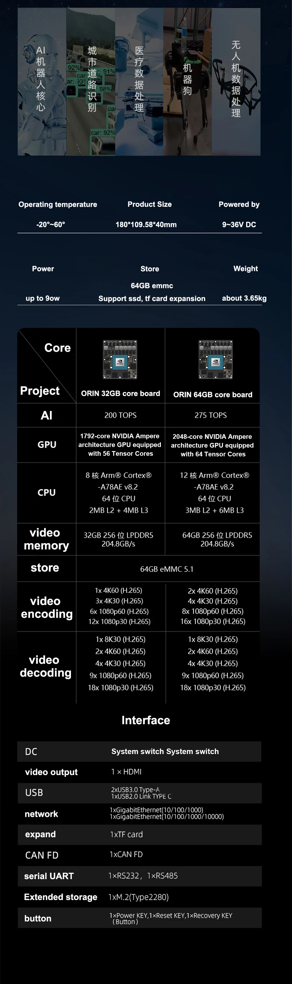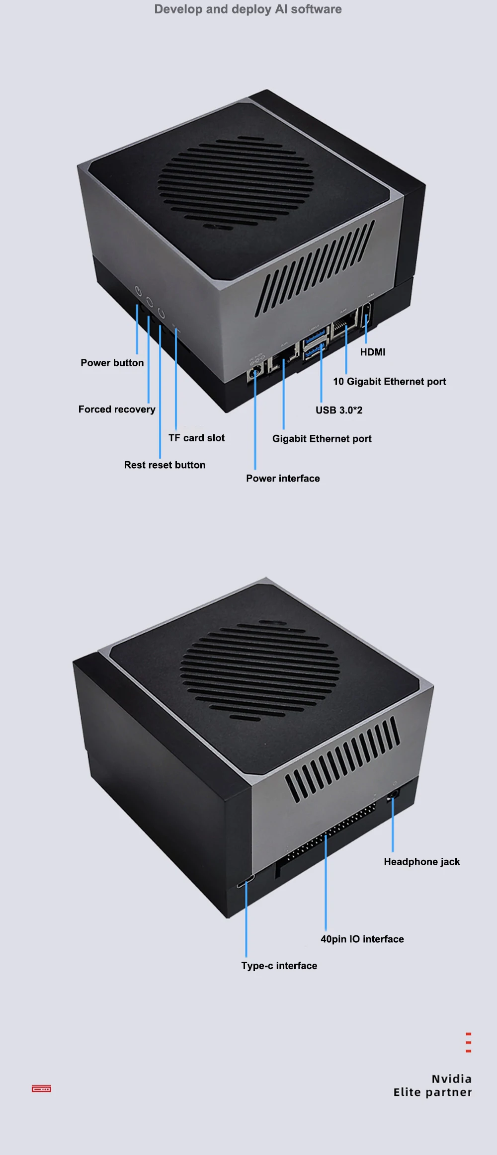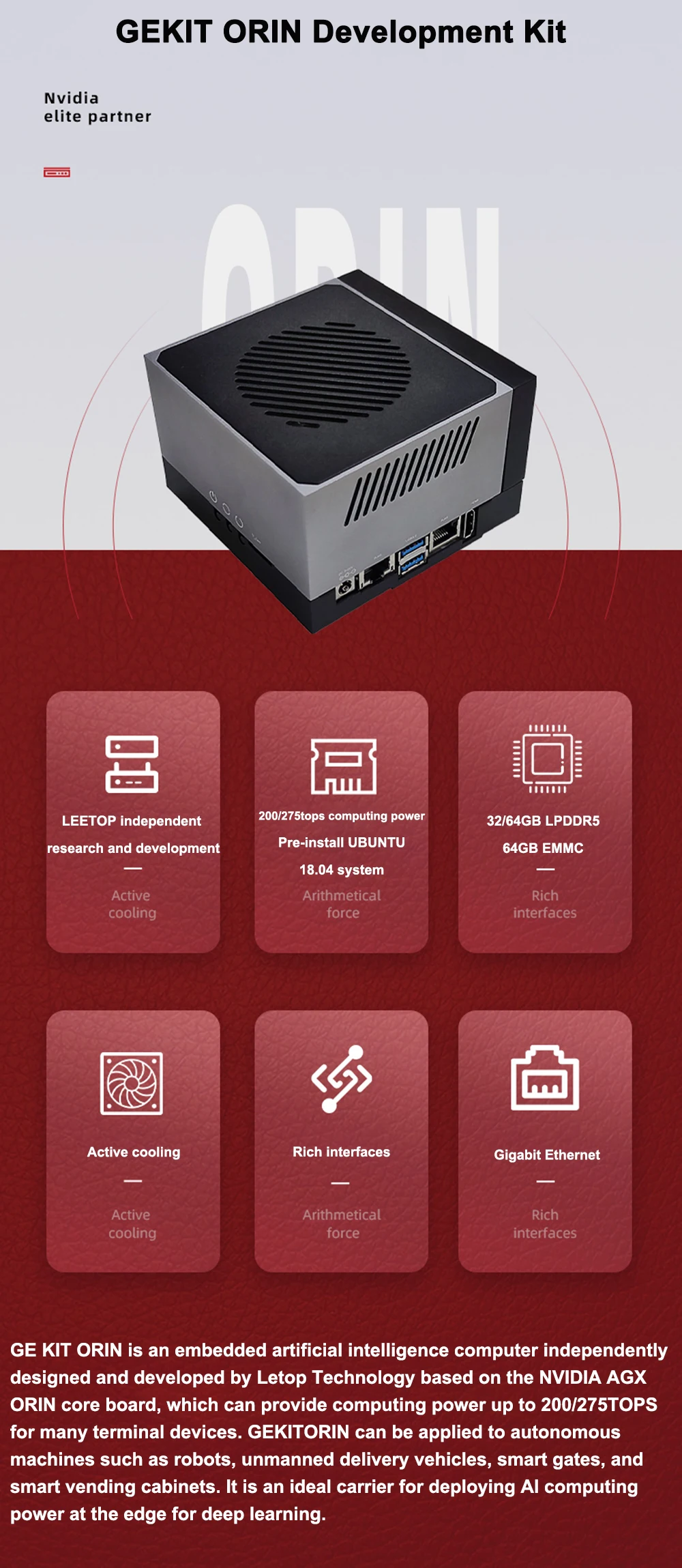 The Leetop GeKit Development System, powered by the NVIDIA Jetson AGX Orin™ module, helps you speed innovation. It’s integrated with NVIDIA tools and workflows that let you train neural networks faster, which means more iterations and better accuracy. It’s also supported by NVIDIA CUDA®, cuDNN, and TensorRT™ software libraries, as well as JetPack and DeepStream SDKs. This helps you boost performance while reducing development costs and effort. Desktop brackets and wall mounting brackets are available for your convenience. It is equipped with a variety of peripheral accessories: multiple GMSL cameras, multiple CSI cameras, etc.