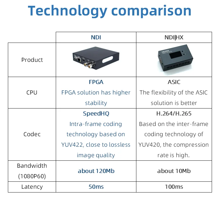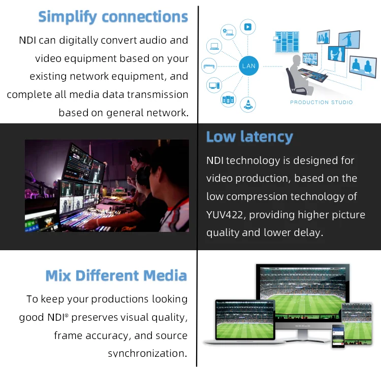 NDI® is mainly divided into two types, High Bandwidth NDI® (High Bandwidth NDI®, commonly known as Full NDI in China) and NDI®丨HX. All of them can transmit high-quality video over IP. High-bandwidth NDI® features high-quality video transmission over IP with low latency, while NDI®丨HX features support for efficient video transmission under limited bandwidth.