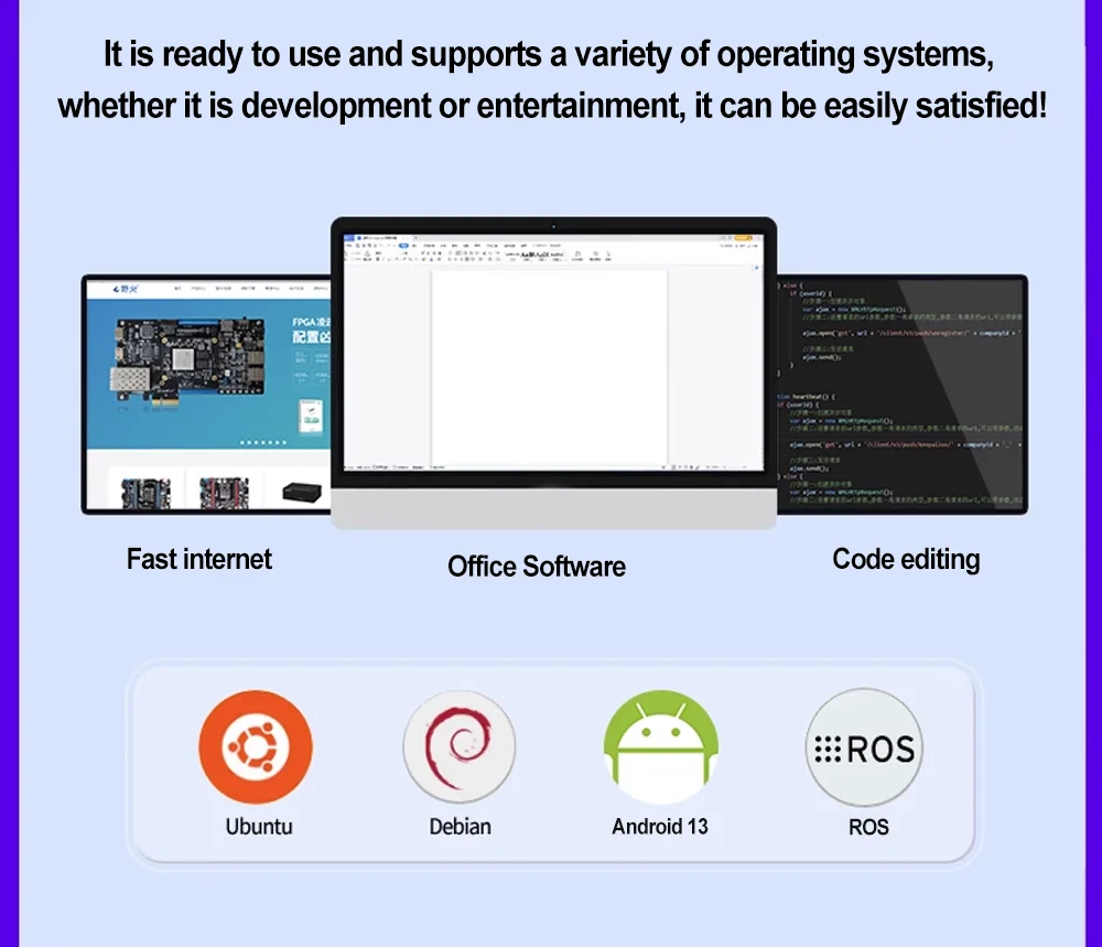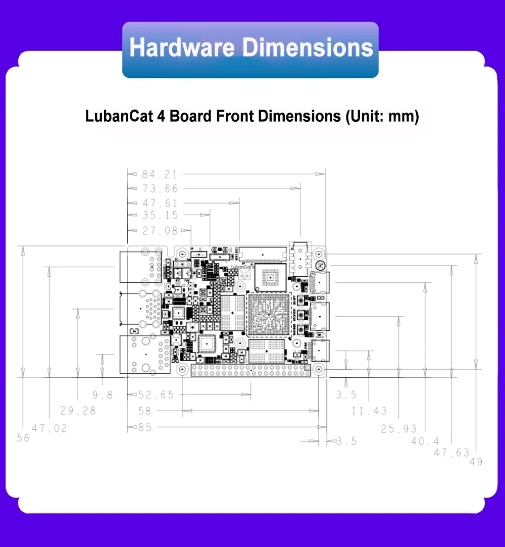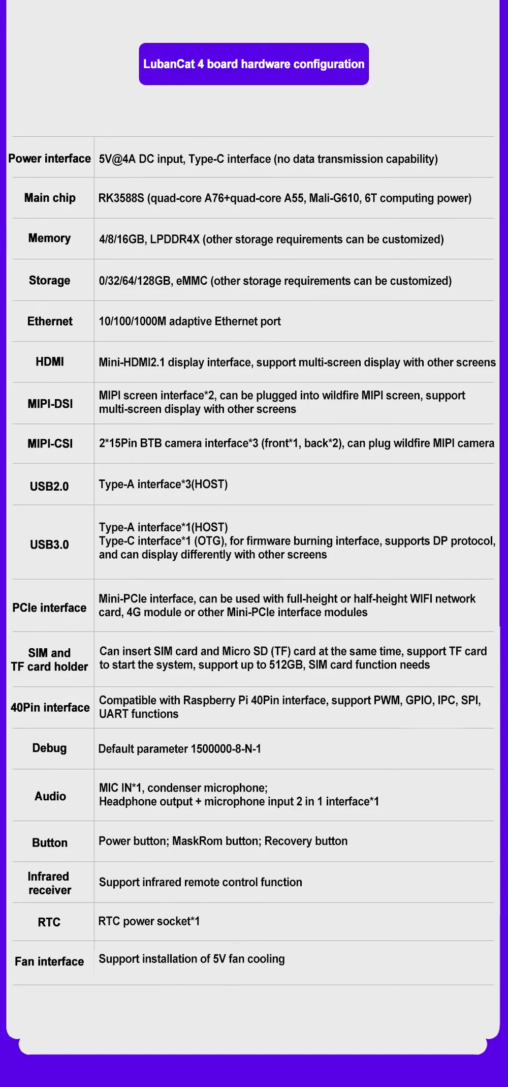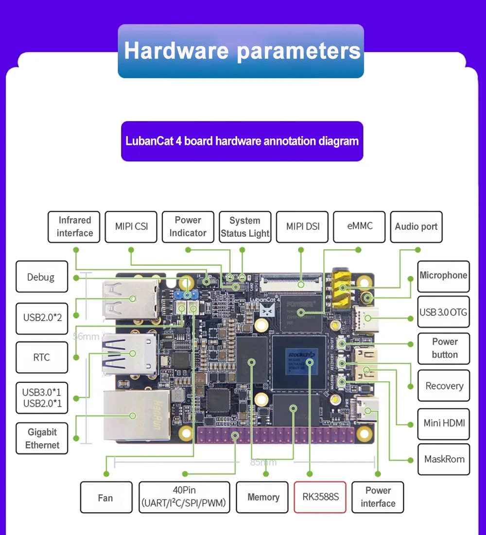 This allows LubanCat-4 to be used not only as a high-performance single-board computer, but also as an embedded motherboard for display, control, network transmission, file storage, edge computing and other scenarios.