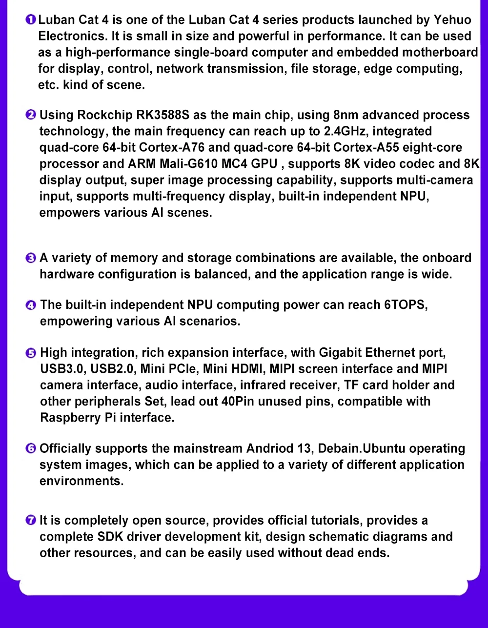 The LubanCat-4 board provides a complete SDK driver development package, design schematics and other resources, which helps users further apply the board while greatly reducing the secondary development time based on this board and accelerating product launch.