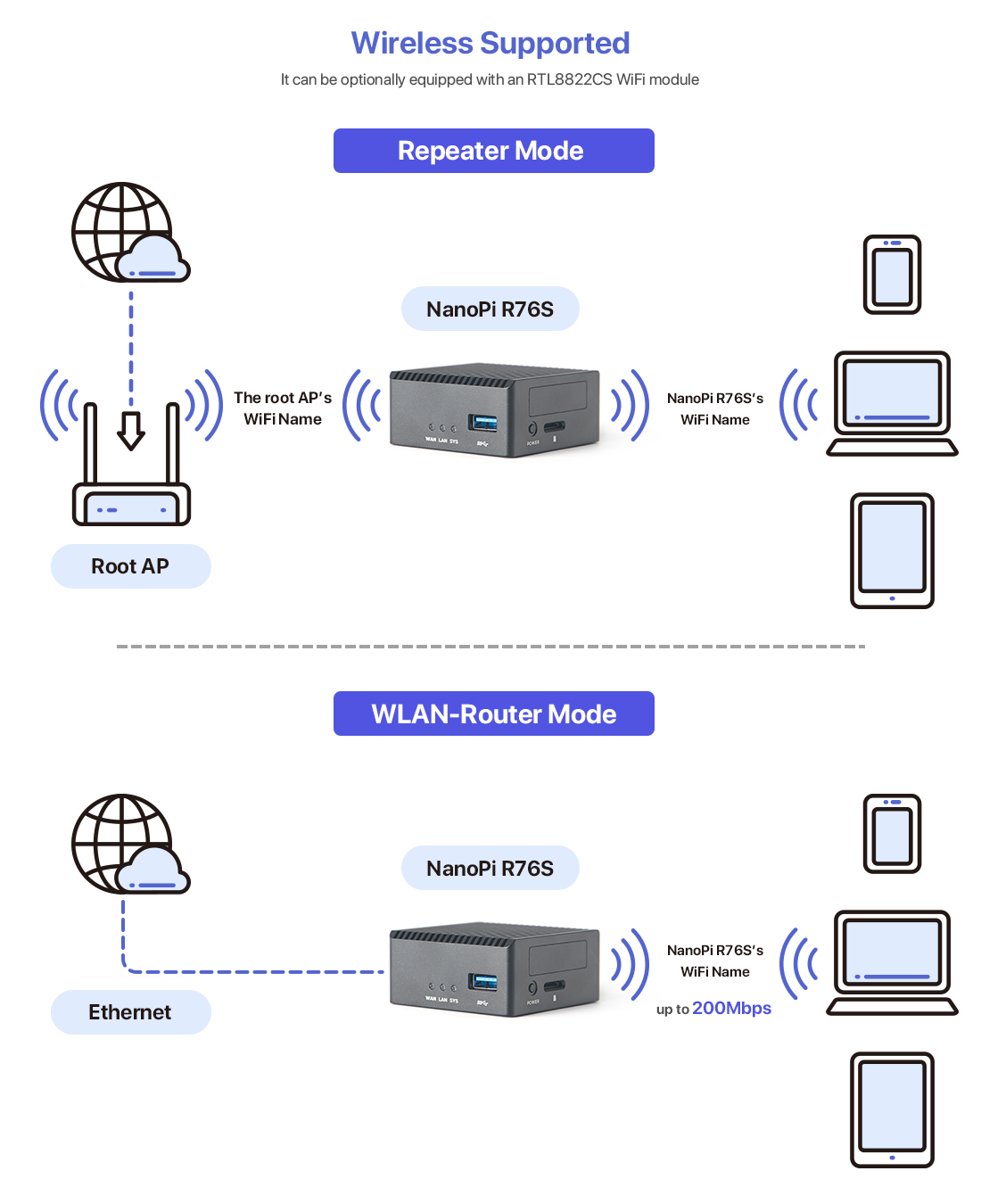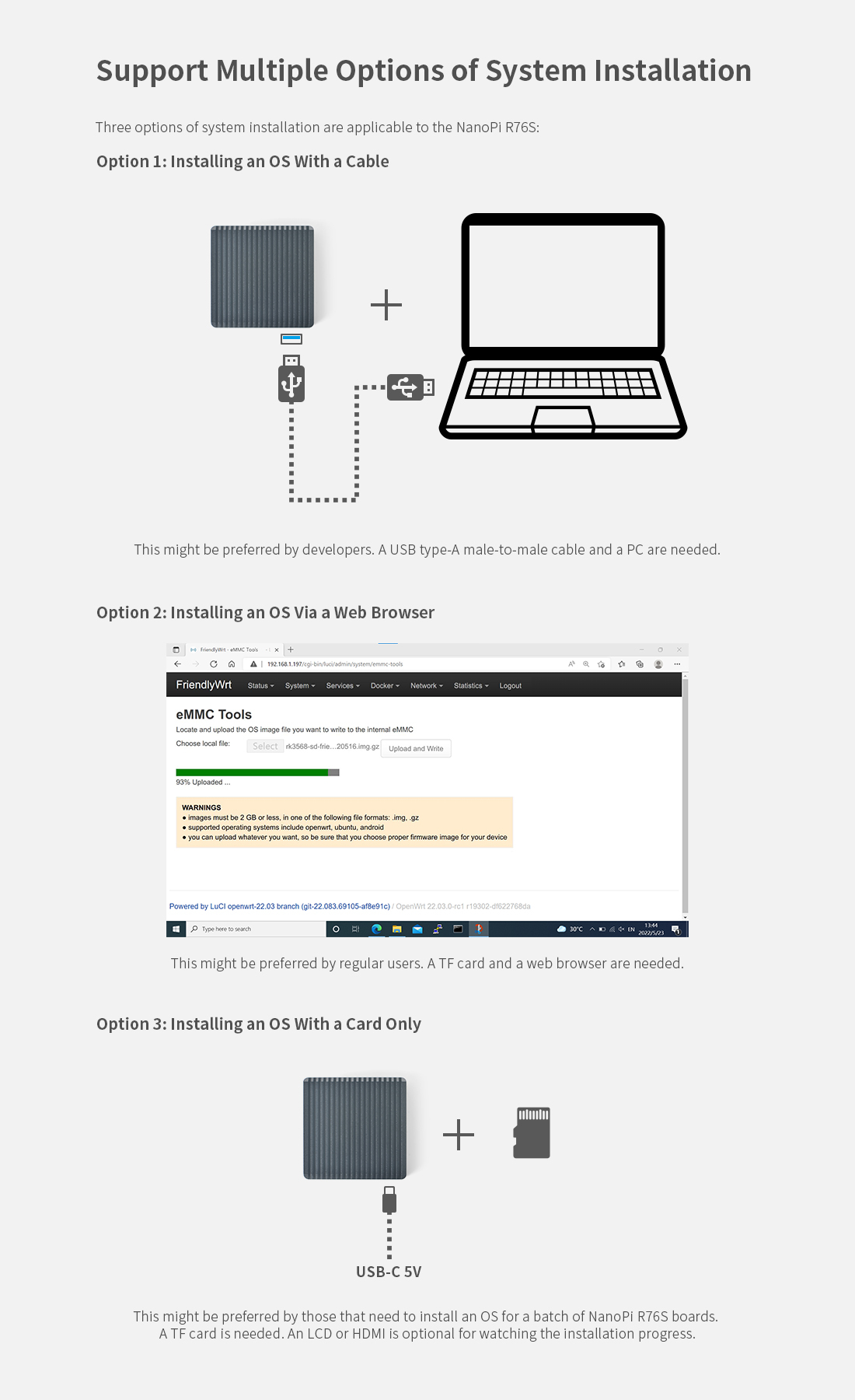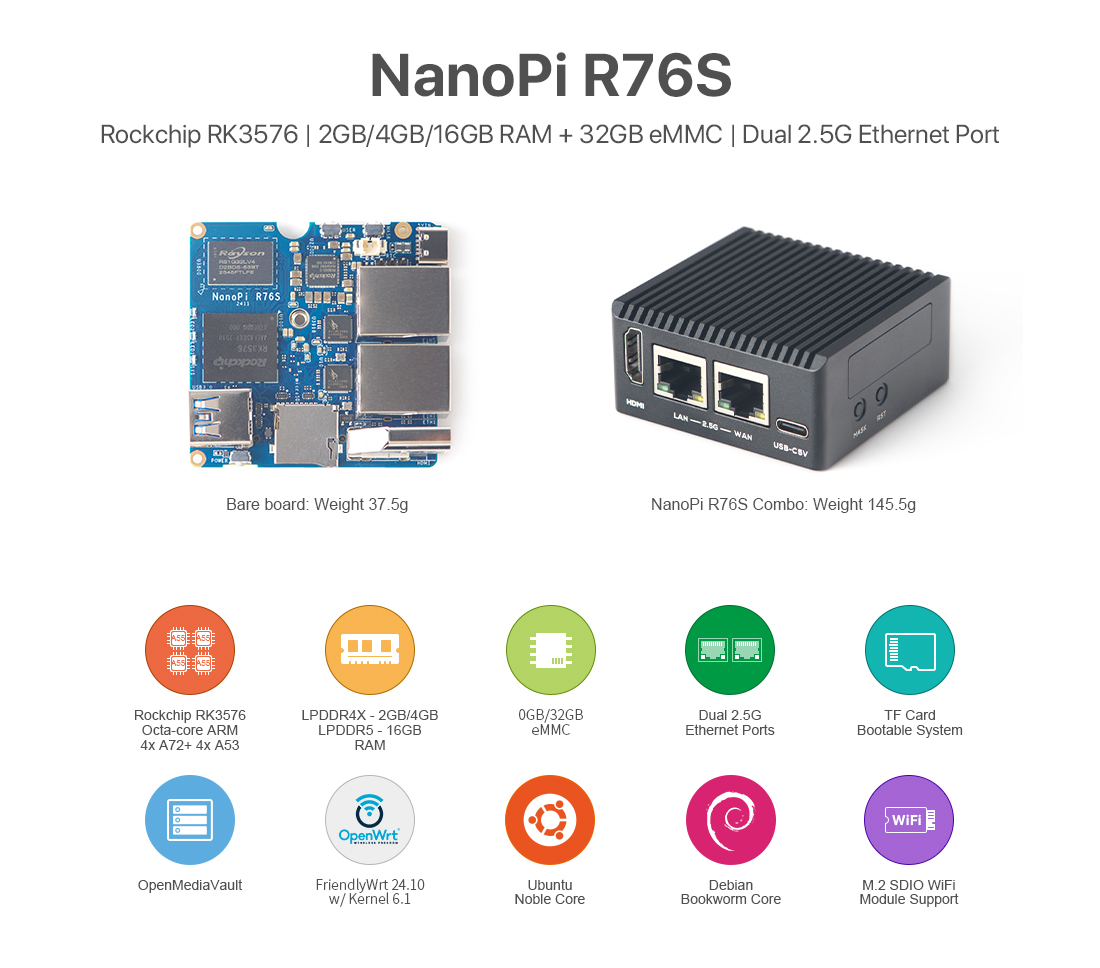 Whether you're building a soft router, setting up a NAS, or creating an IoT project, the NanoPi R76S provides a reliable and powerful solution. It supports multiple operating systems, including Debian, Ubuntu, and OpenMediaVault, ensuring easy setup and customization to meet your specific needs.