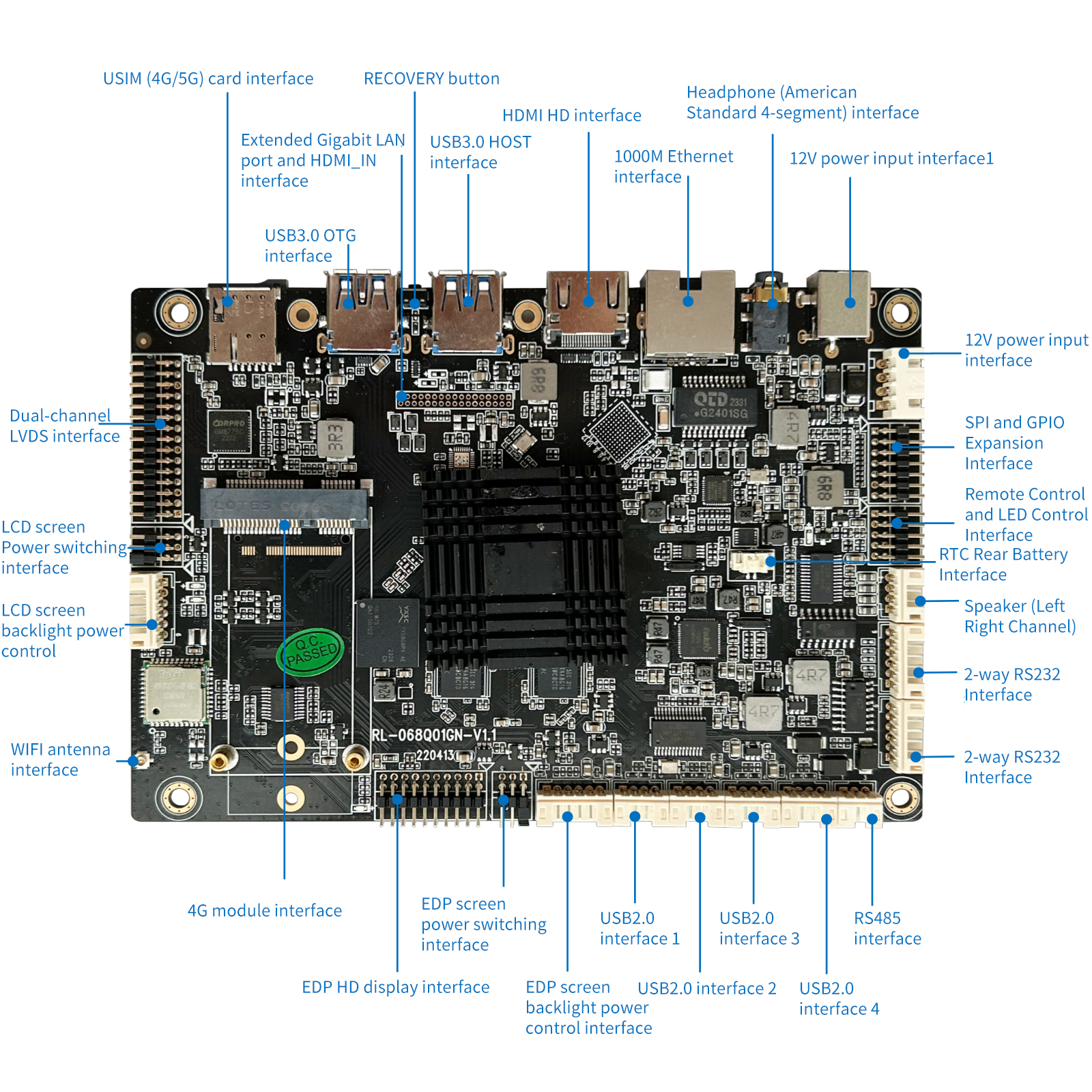 The RL-068Q01GN motherboard, powered by RK3568 quad-core 64-bit ARM chip and Android 11, offers high performance and stability. With a 0.8TOPS NPU and support for dual-screen display, it features 2 USB3.0,4 USB2.0,4 RS232,1 RS485 ports and more. Ideal for identity recognition, digital signage, interactive kiosks etc. It also supports 4G/5G expansion, dual-band WiFi and Bluetooth, meeting high-speed wireless communication needs and providing reliable core support for intelligent upgrades.