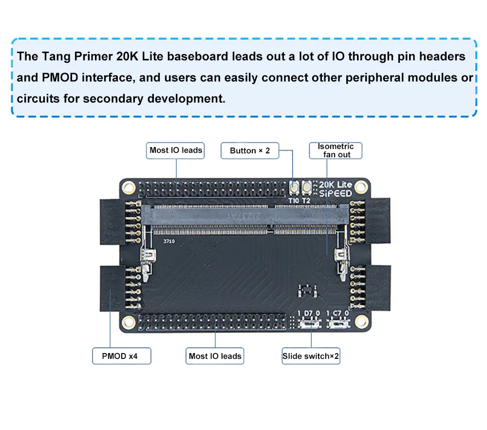 Tang Primer 20K is a core board with DDR3 sodimm shape based on GW2A-LV18PG256C8/I7 as the main chip, with 2 ext-boards are prepared, the Dock and the Lite.