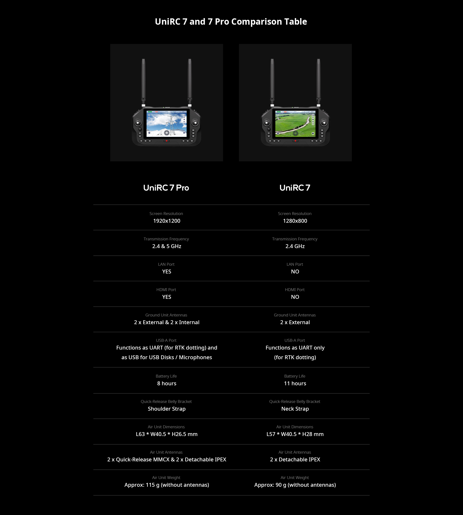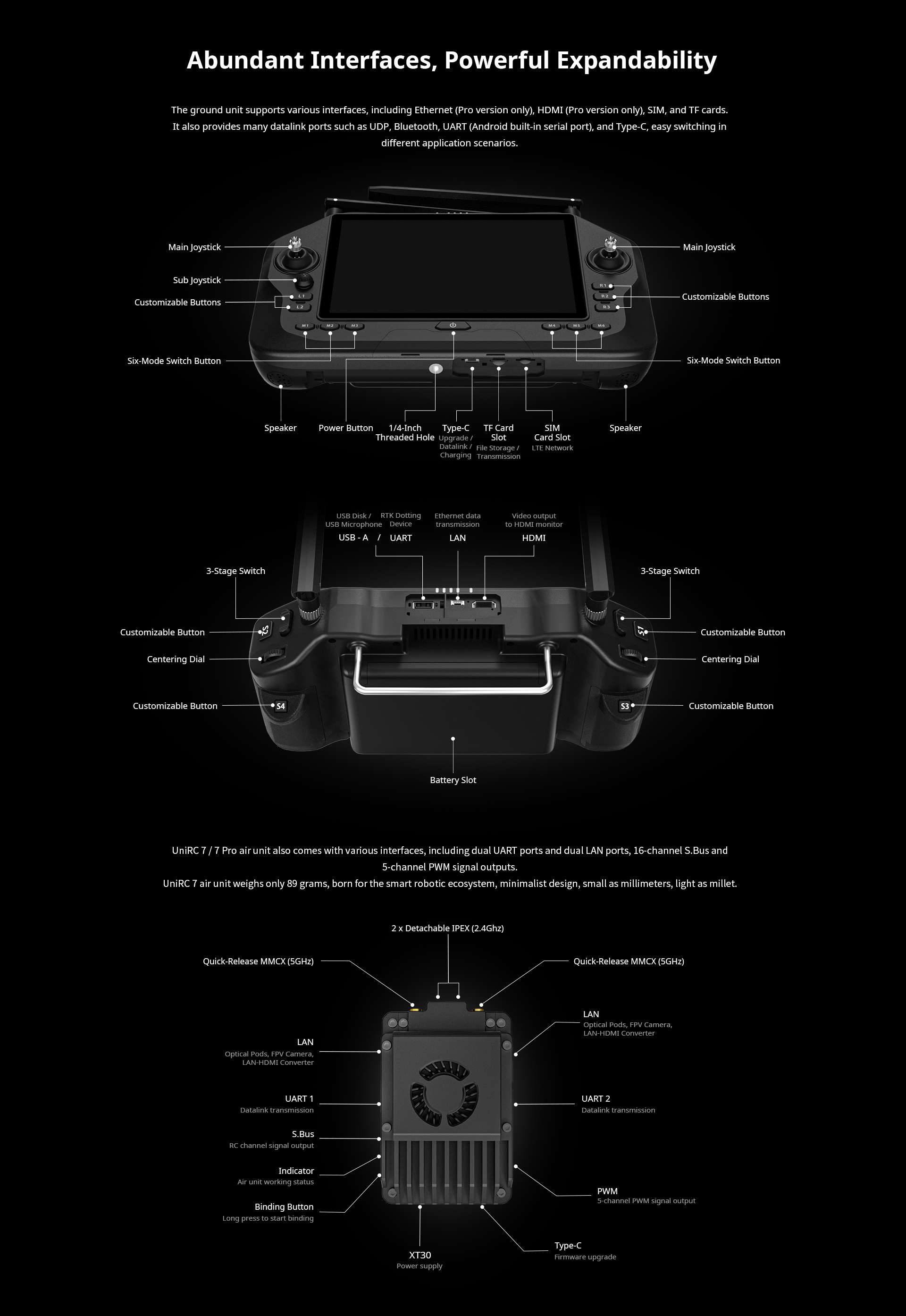 UniRC 7 Pro: External Device (Mouse, USB Disk, USB Microphone): USB-A Serial Port (for RTK Dotting Module): USB-A File Transfer: USB-A Video Output: Standard HDMI Network Communication: LAN (GH1.25 4-Pin) UniRC 7: Serial Port (for RTK Dotting Module): USB-A Charging: Type-C Firmware Upgrade: Type-C File Transfer: Type-C Mobile Network: SIM Card Slot External Storage: TF Card Slot / USB-A Tripod Mount: 1/4-inch Standard Screw Hole |
