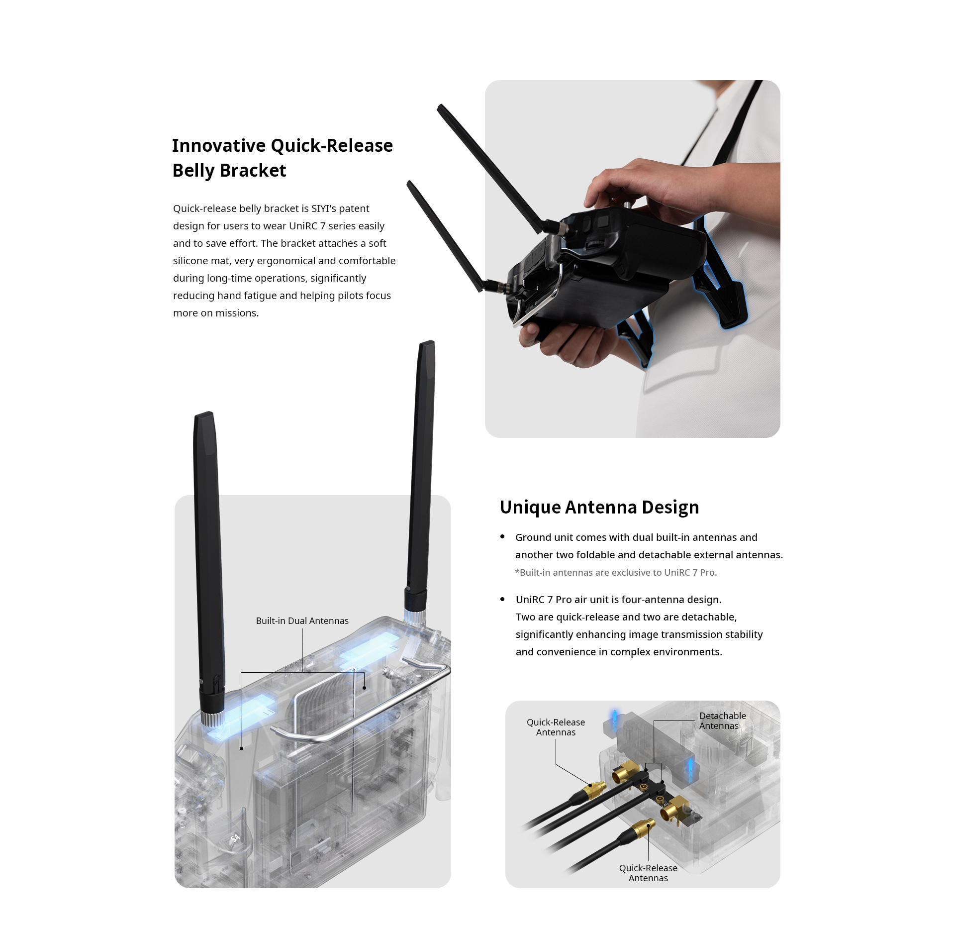 [Rugged & Field-Focused] IP54 housing, foldable antennas, quick-release belly support, shoulder strap included.