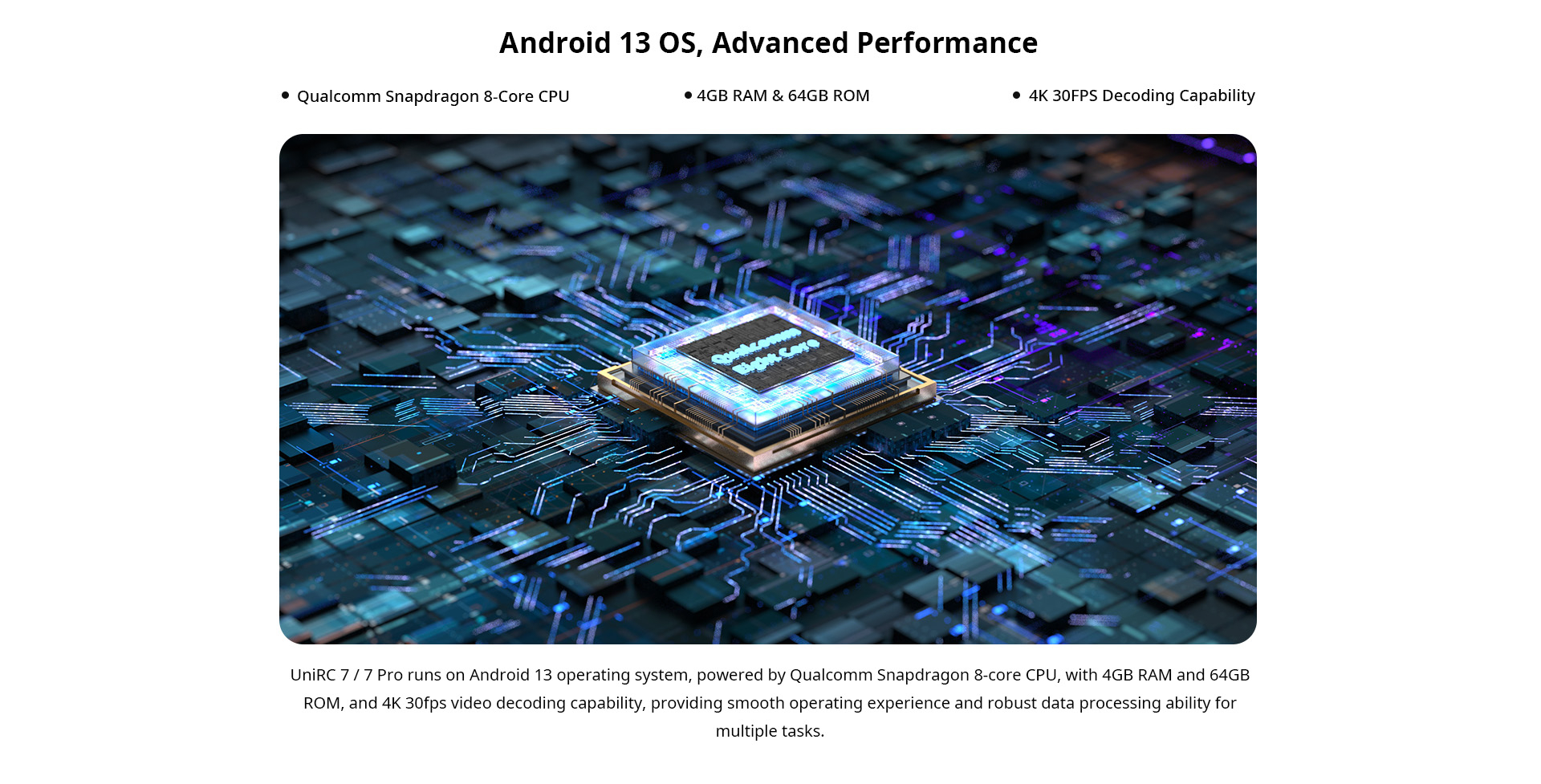 [Android 13 Ready] Qualcomm octa-core CPU, 4 GB RAM, 64 GB ROM, Wi-Fi 5 & BT 5.0 for third-party apps.