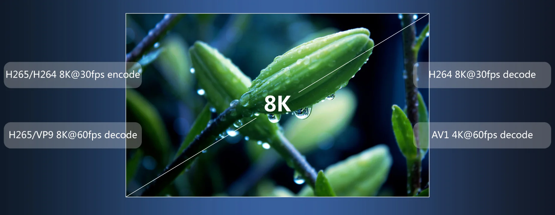 Support 8K@6Ofps H.265NP9 video decoding and &k@R 30ips H.25/H.264Video coding , super video coding and decoding ablity makes the picture detais cearet