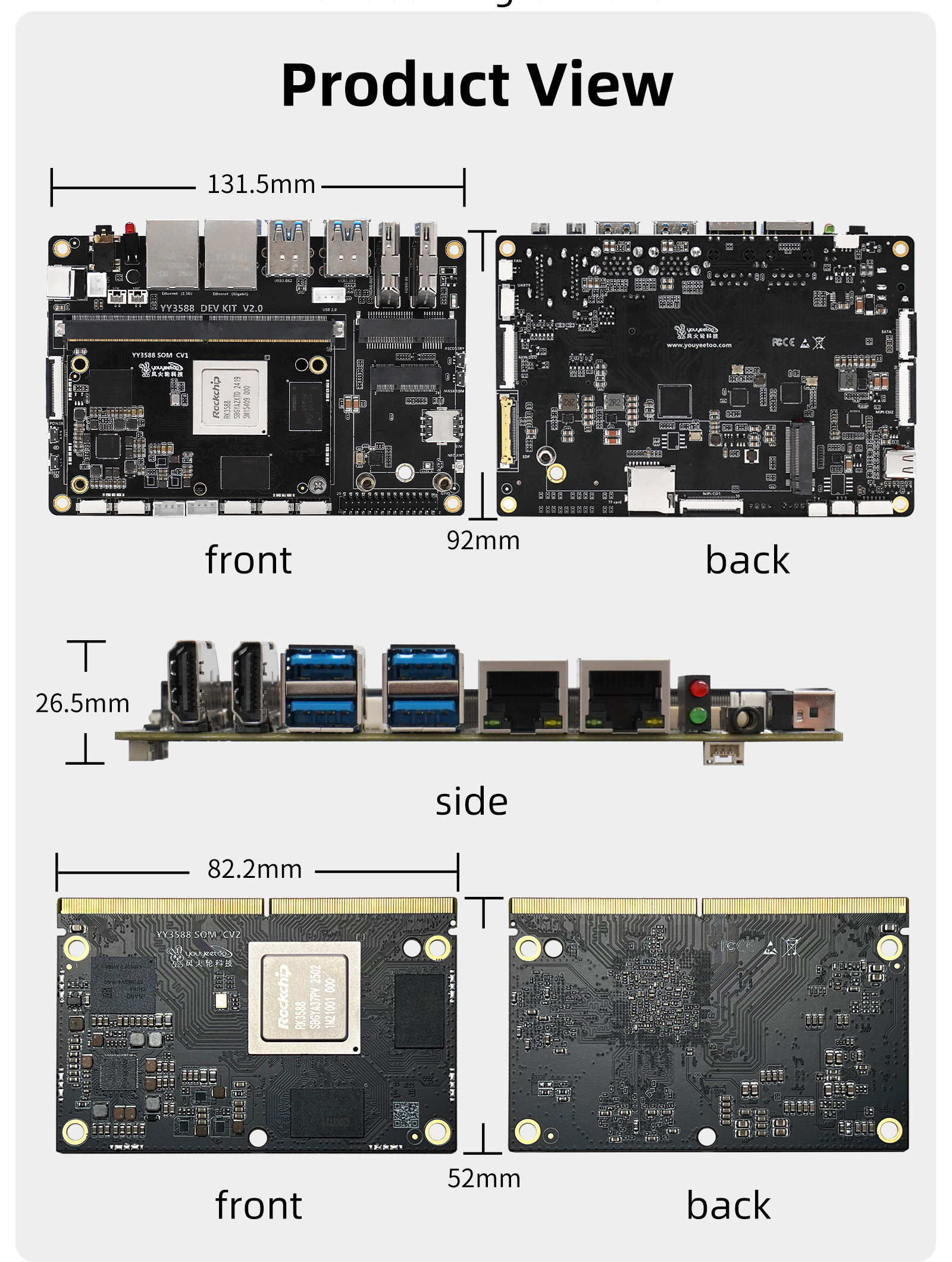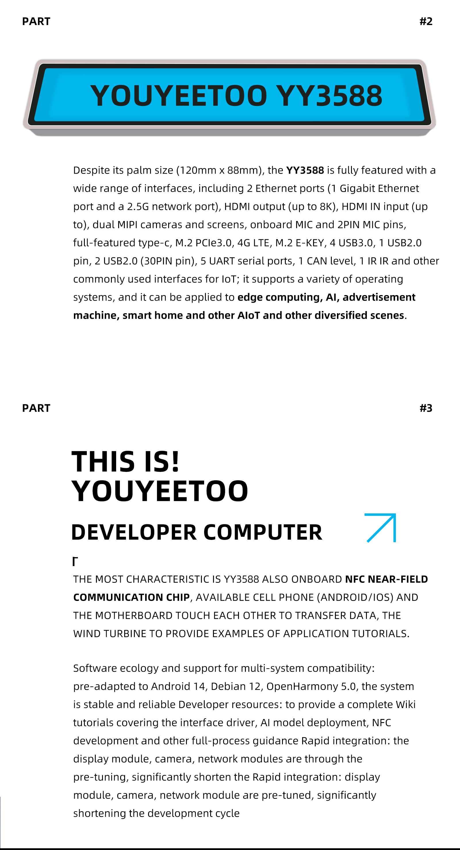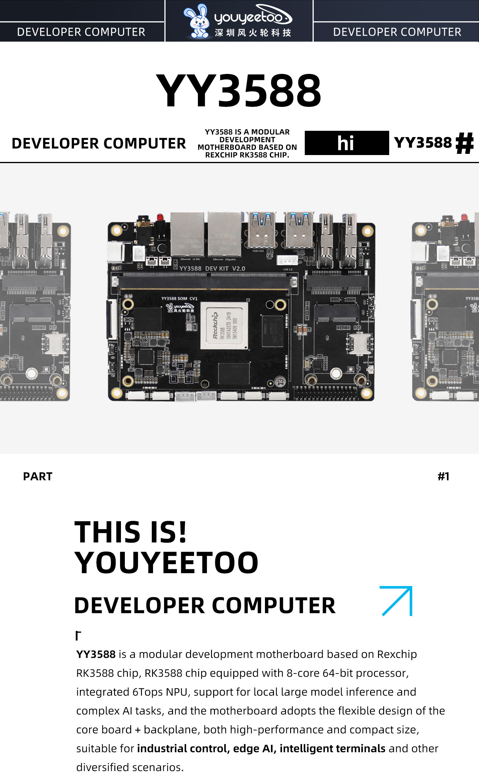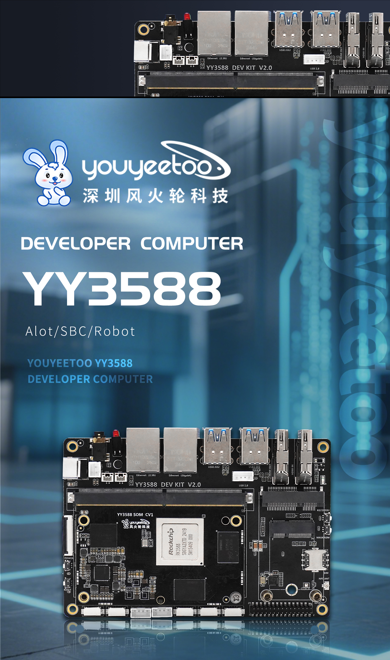 The YOUYEETOO YY3588 Single Board Computer is a high-performance industrial electronic product based on the Rockchip RK3588 chip. The chip is manufactured using an 8nm process and features 8 core (4×A76 @2.4GHz + 4×A55 @1.8GHz) with a clock speed of up to 2.4GHz. It also incorporates a tri-core NPU with a computing power of 6 TOPS, supporting mixed-precision computations and multiple model transformations.