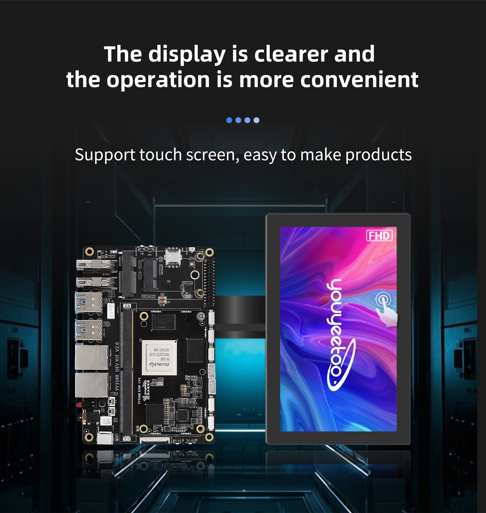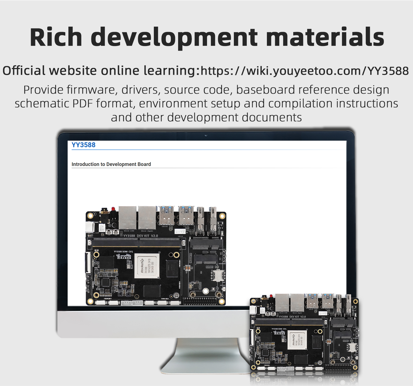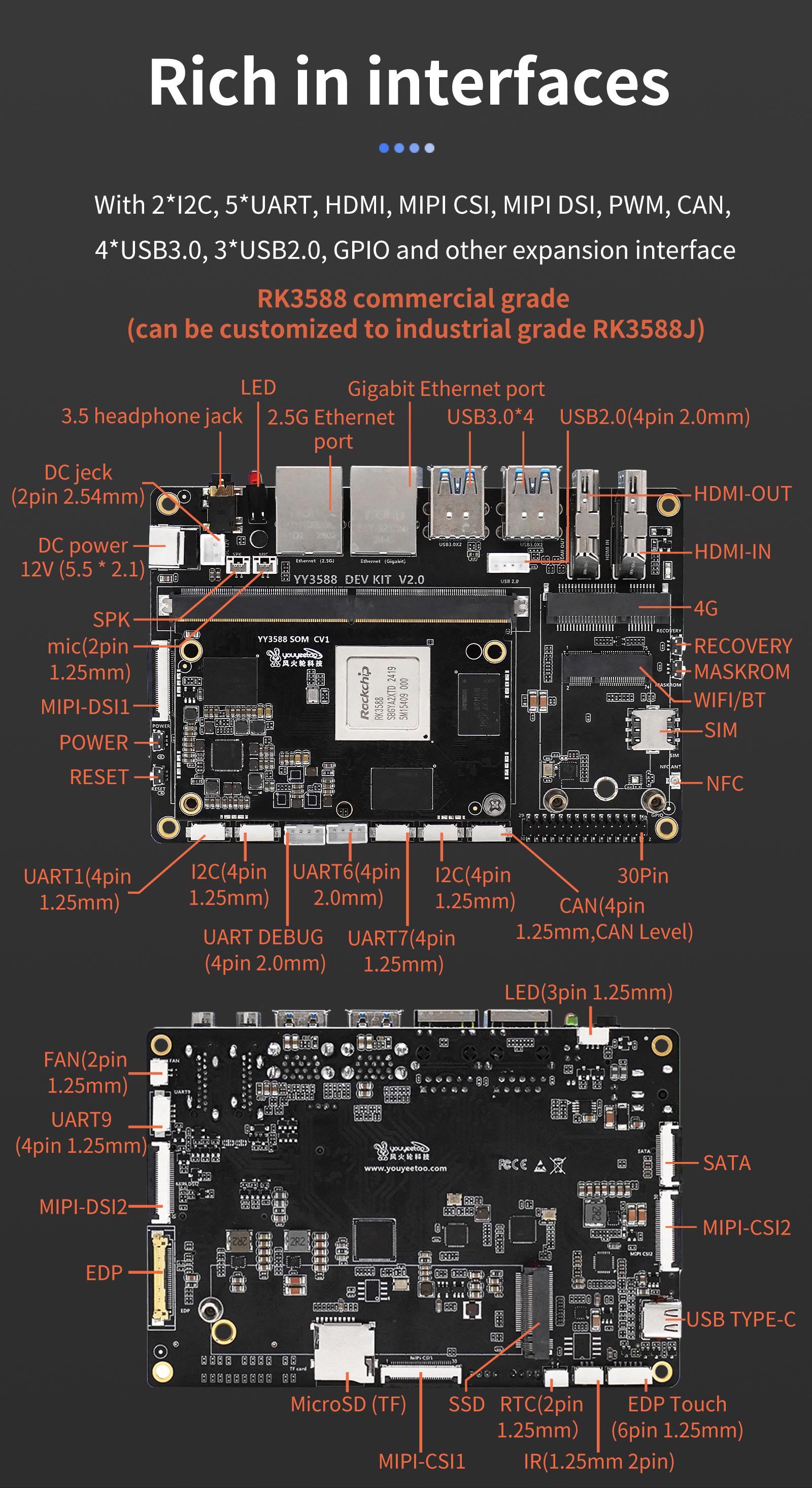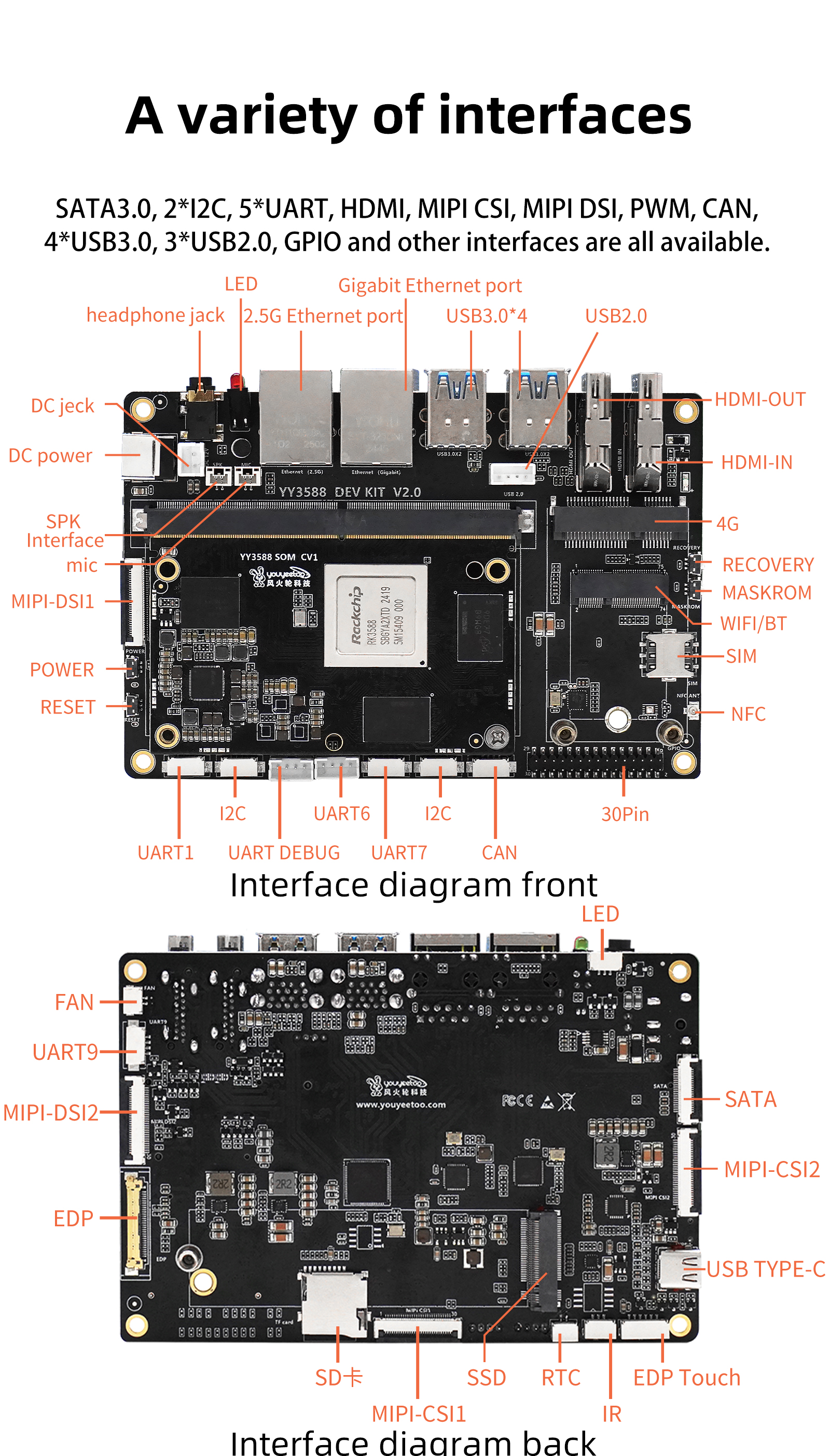 The YOUYEETOO YY3588 Single Board Computer is a high-performance industrial electronic product based on the Rockchip RK3588 chip. The chip is manufactured using an 8nm process and features 8 core (4×A76 @2.4GHz + 4×A55 @1.8GHz) with a clock speed of up to 2.4GHz. It also incorporates a tri-core NPU with a computing power of 6 TOPS, supporting mixed-precision computations and multiple model transformations.