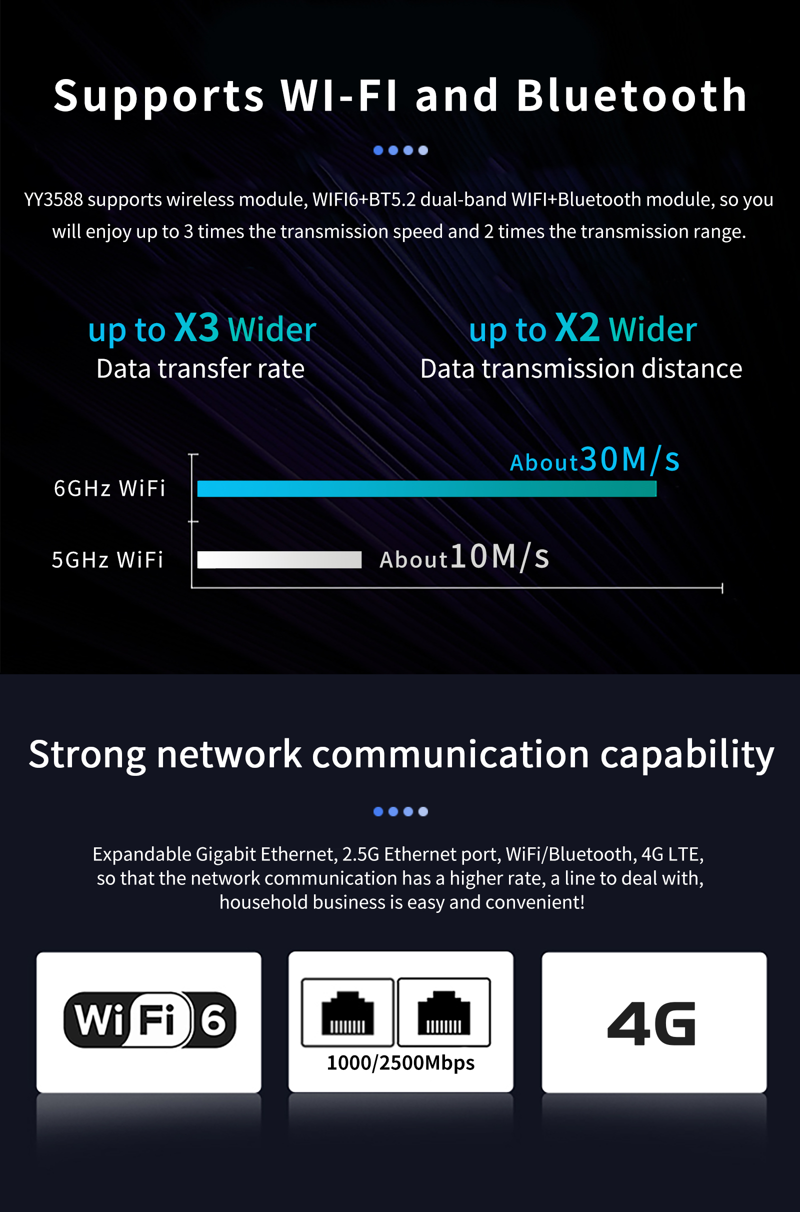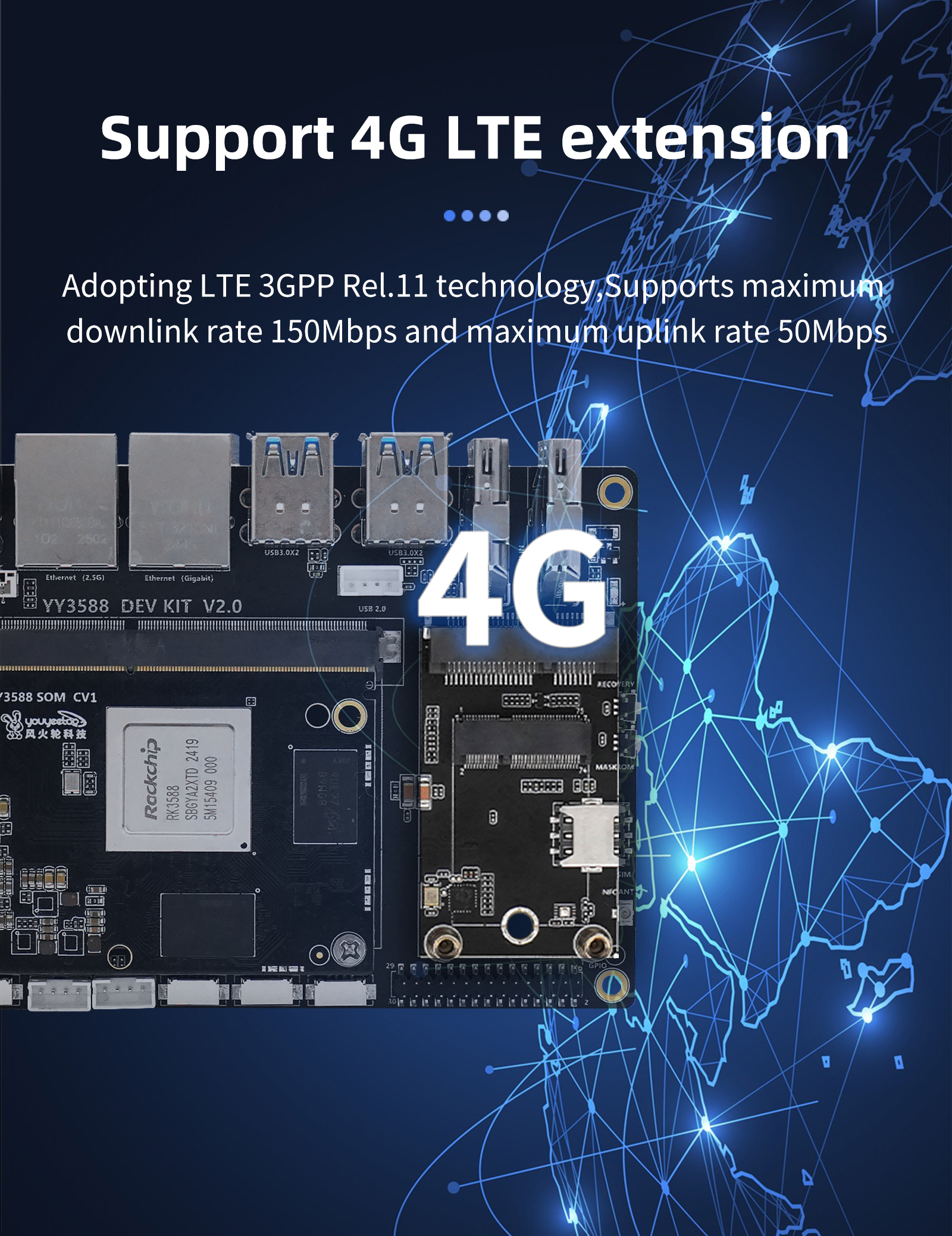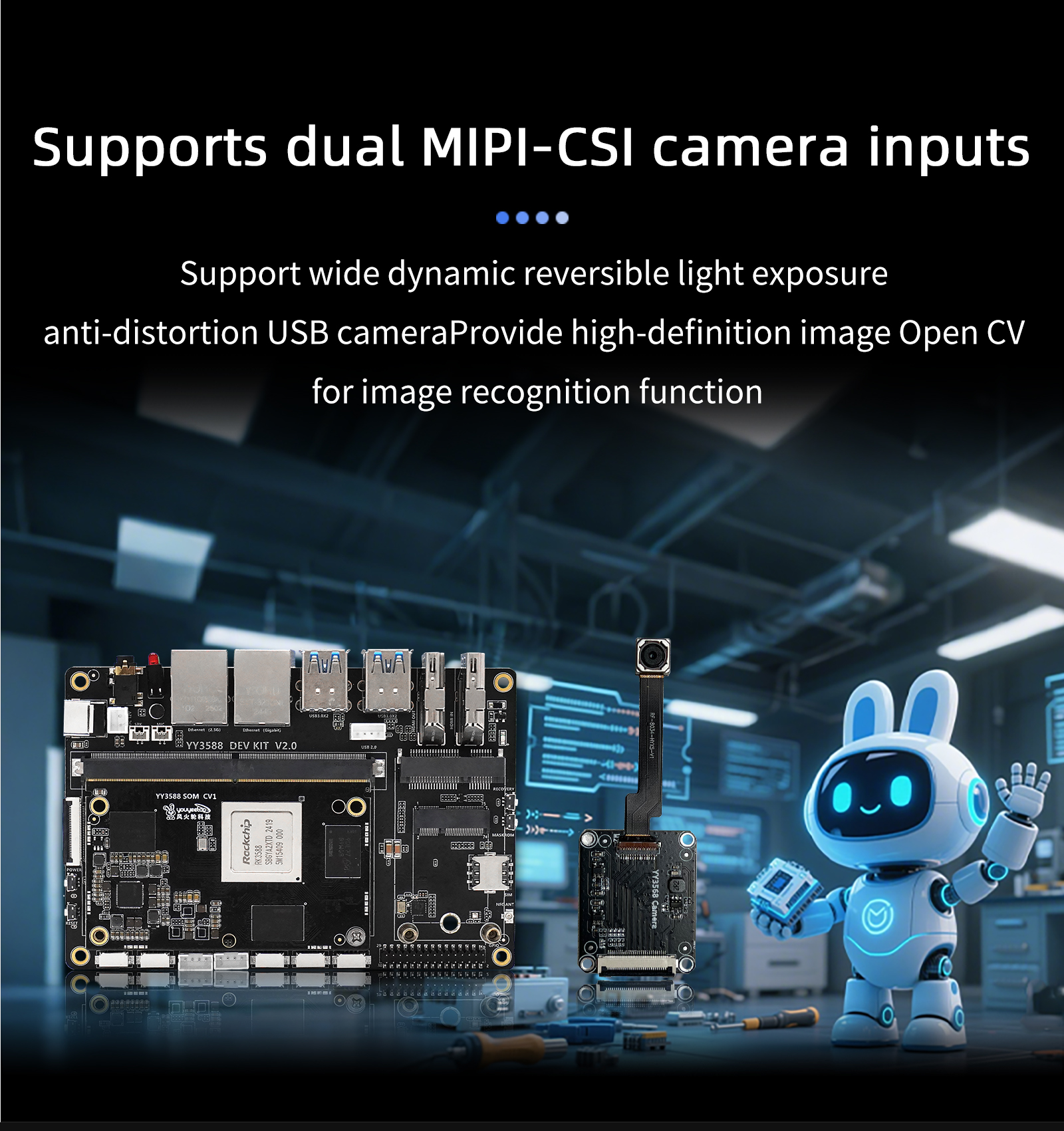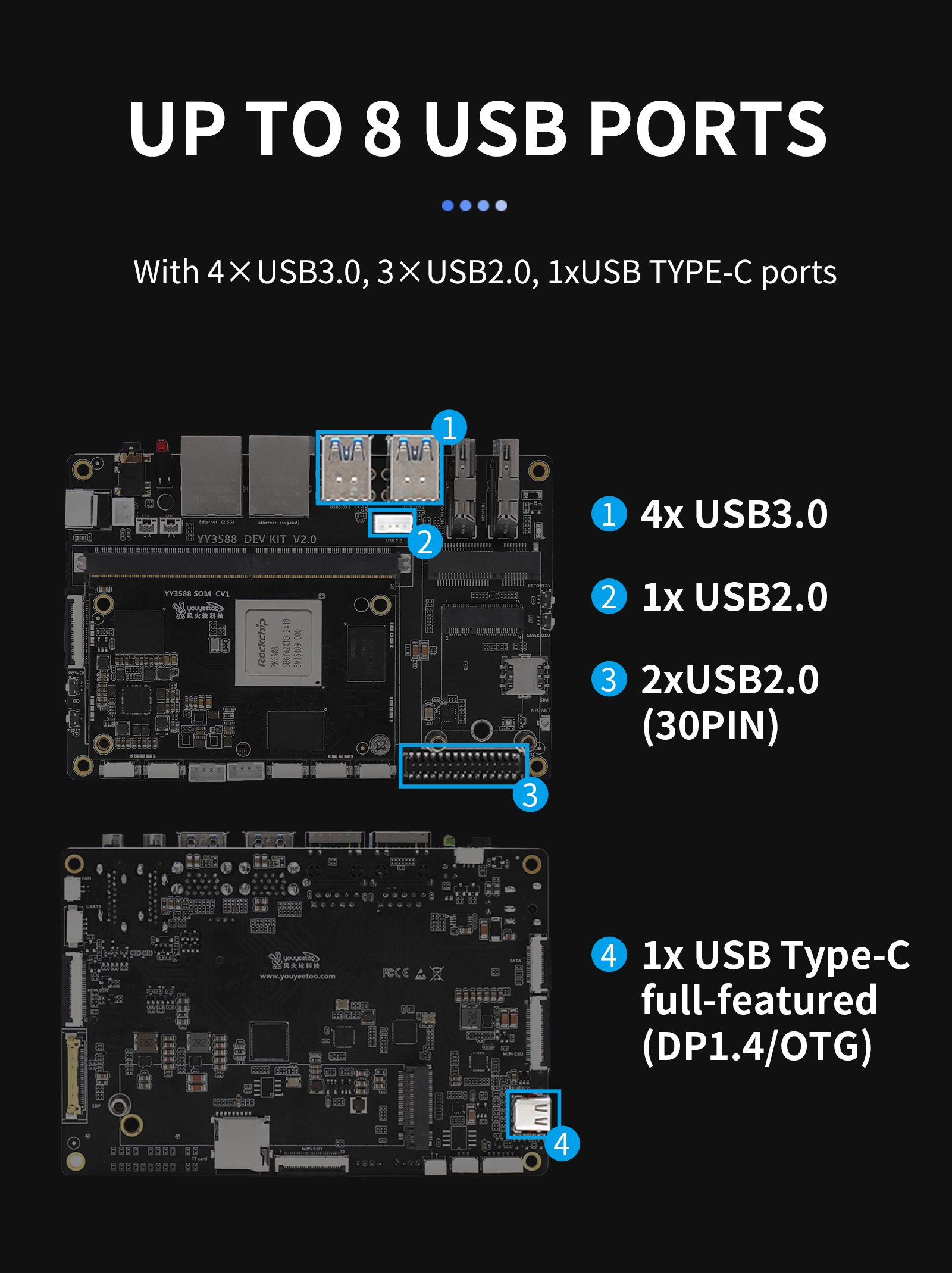 The YOUYEETOO YY3588 Single Board Computer is a high-performance industrial electronic product based on the Rockchip RK3588 chip. The chip is manufactured using an 8nm process and features 8 core (4×A76 @2.4GHz + 4×A55 @1.8GHz) with a clock speed of up to 2.4GHz. It also incorporates a tri-core NPU with a computing power of 6 TOPS, supporting mixed-precision computations and multiple model transformations.