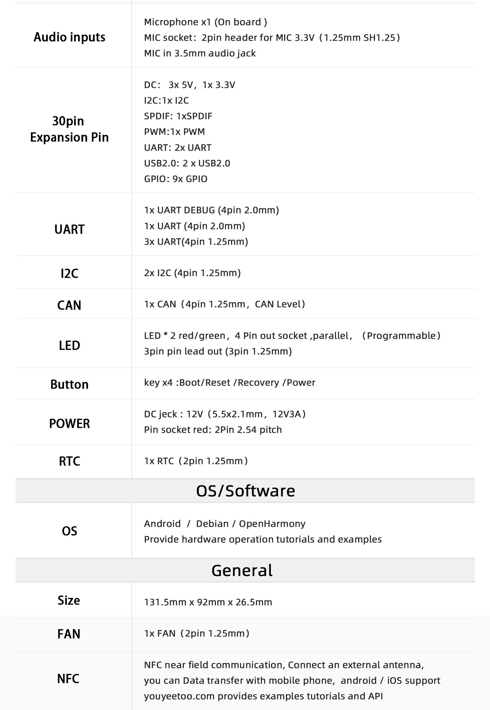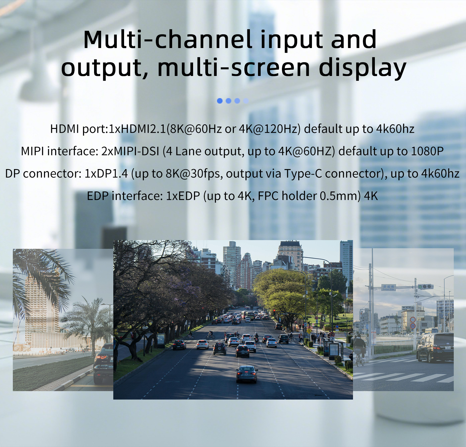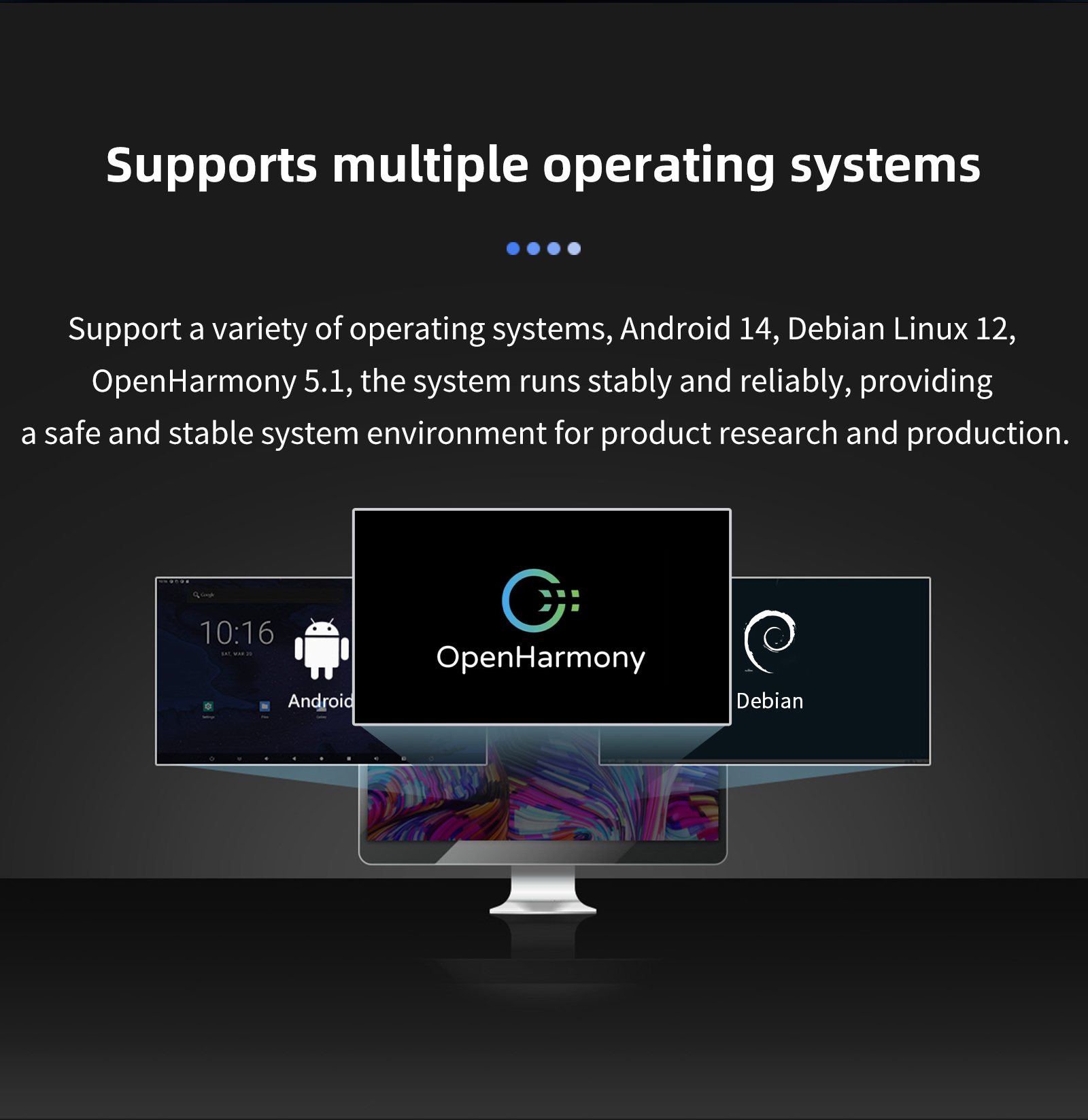 The single board computer is equipped with LPDDR4/4X memory, offering frequencies of up to 3200Mbps and capacities ranging from 4GB to 32GB. It includes onboard eMMC5.1 flash storage in various capacities of 32G, 64G, 128G, or 256GB. Additionally, it supports SPI Flash, M.2 M-Key interface NVMe 2280 SSDs, SATA3.0 interface, and a MicroSD card slot. In terms of networking, it is equipped with 1x Gigabit Ethernet port and 1x 2.5G Ethernet port. It can be extended via an M.2 slot and defaults to supporting the RTL8852BE Wi-Fi 6 + BT5.2 dual-band Wi-Fi + Bluetooth module. It also supports a MiniPCIE interface + SIM card slot for 4G LTE. The display output interfaces are abundant, featuring 1x HDMI 2.1 interface supporting 8K@60fps or 4K@120fps, 2x MIPI DSI DPHY interfaces with 4 Lane output and up to 4K@60HZ resolution, 1x DP1.4 interface supporting up to 8K@30fps via a Type-C port, and 1x EDP interface. For video input, it has 2x MIPI CSI DPHY interfaces (1x4 lanes or 2x2 lanes), 30Pin-0.5mm, and 1x HDMI-IN interface supporting 4K@60fps and HDCP 2.3. The single board computer adopts a modular architecture with a core board and a base board. The core board measures 82mm×53mm, and the base board has a default size of 120mm×88mm. It offers a variety of interfaces, including audio, buttons, USB, UART, I2C, CAN, RTC, LED lights, power, NFC, infrared IR, fan FAN, and 30-pin expansion pins. It is pre-adapted to multiple mainstream operating systems such as Android 14, Debian 12, Ubuntu 22.04, Buildroot, and OpenHarmony 5.1.