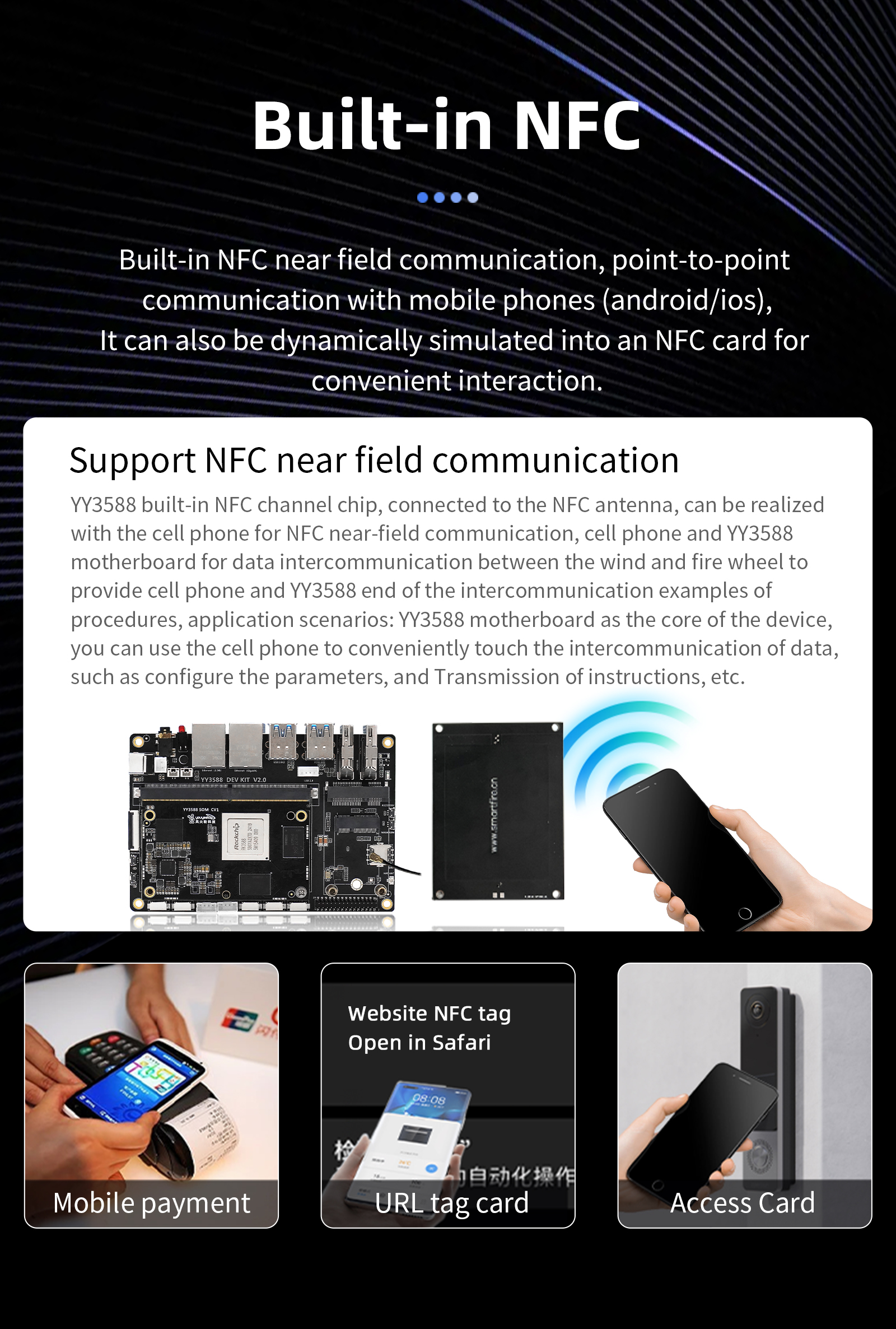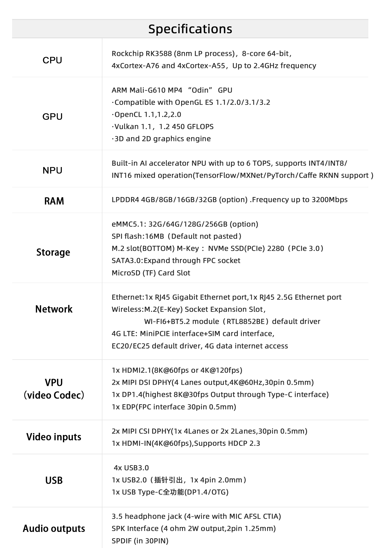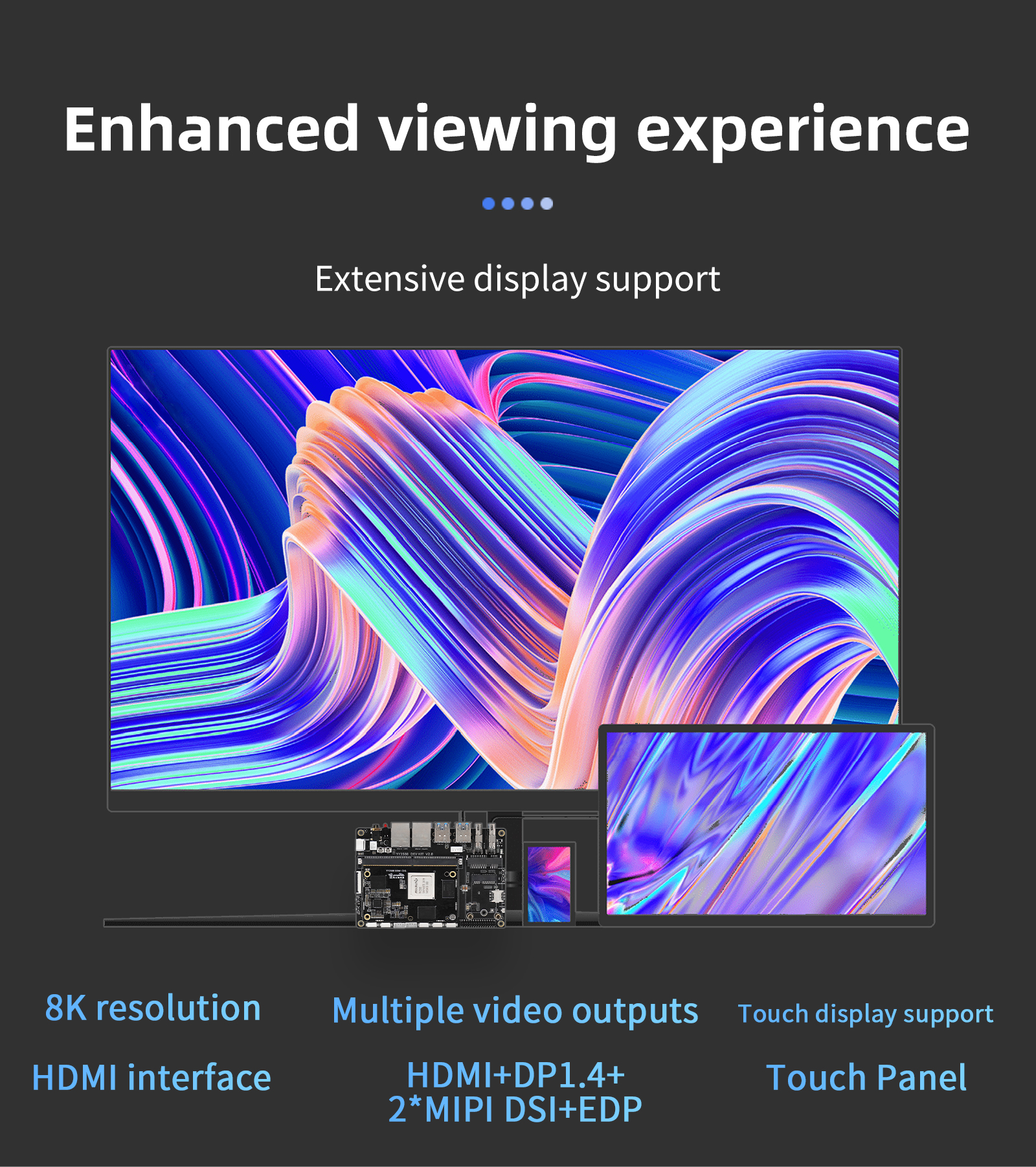 The single board computer is equipped with LPDDR4/4X memory, offering frequencies of up to 3200Mbps and capacities ranging from 4GB to 32GB. It includes onboard eMMC5.1 flash storage in various capacities of 32G, 64G, 128G, or 256GB. Additionally, it supports SPI Flash, M.2 M-Key interface NVMe 2280 SSDs, SATA3.0 interface, and a MicroSD card slot. In terms of networking, it is equipped with 1x Gigabit Ethernet port and 1x 2.5G Ethernet port. It can be extended via an M.2 slot and defaults to supporting the RTL8852BE Wi-Fi 6 + BT5.2 dual-band Wi-Fi + Bluetooth module. It also supports a MiniPCIE interface + SIM card slot for 4G LTE. The display output interfaces are abundant, featuring 1x HDMI 2.1 interface supporting 8K@60fps or 4K@120fps, 2x MIPI DSI DPHY interfaces with 4 Lane output and up to 4K@60HZ resolution, 1x DP1.4 interface supporting up to 8K@30fps via a Type-C port, and 1x EDP interface. For video input, it has 2x MIPI CSI DPHY interfaces (1x4 lanes or 2x2 lanes), 30Pin-0.5mm, and 1x HDMI-IN interface supporting 4K@60fps and HDCP 2.3. The single board computer adopts a modular architecture with a core board and a base board. The core board measures 82mm×53mm, and the base board has a default size of 120mm×88mm. It offers a variety of interfaces, including audio, buttons, USB, UART, I2C, CAN, RTC, LED lights, power, NFC, infrared IR, fan FAN, and 30-pin expansion pins. It is pre-adapted to multiple mainstream operating systems such as Android 14, Debian 12, Ubuntu 22.04, Buildroot, and OpenHarmony 5.1.